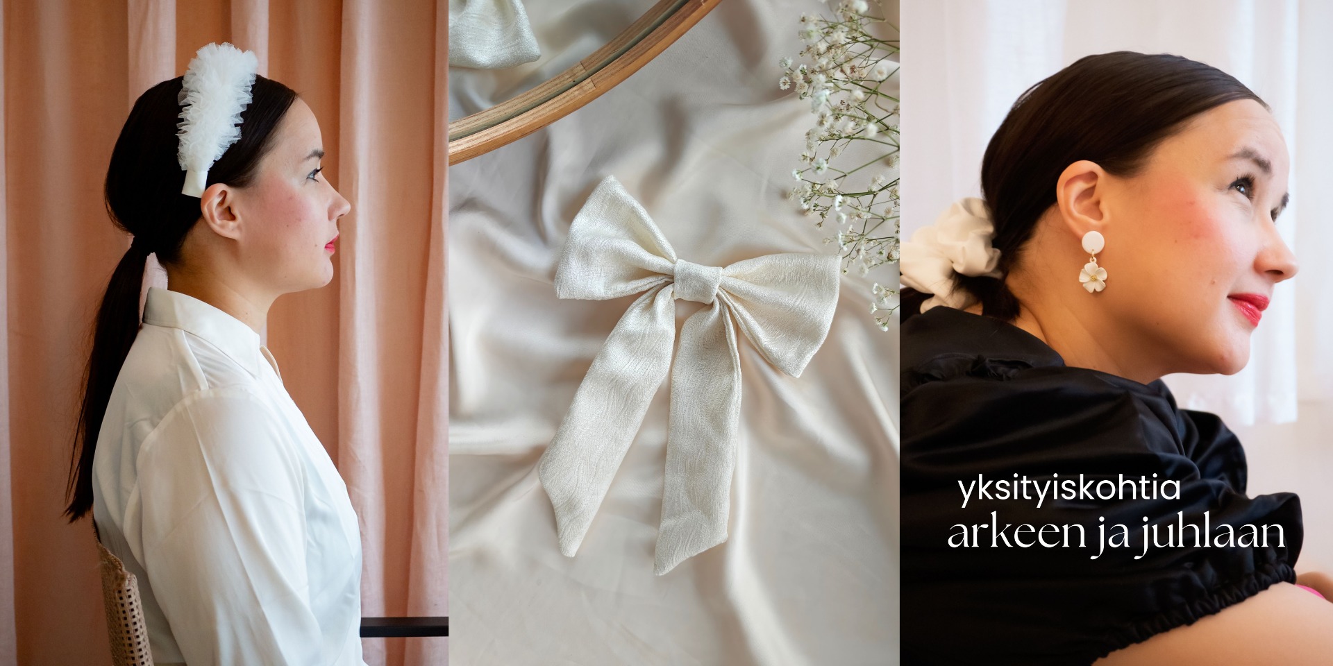 Suloinen, näyttävä rusetti kruunaa arkisenkin kampauksen. Meidän hiusrusettimme on valmistettu tarkkaan valituista materiaaleista. Huolellisesti käsityönä. Klipsikiinnitys varmistaa rusetin pysymisen kampauksessa koko päivän.