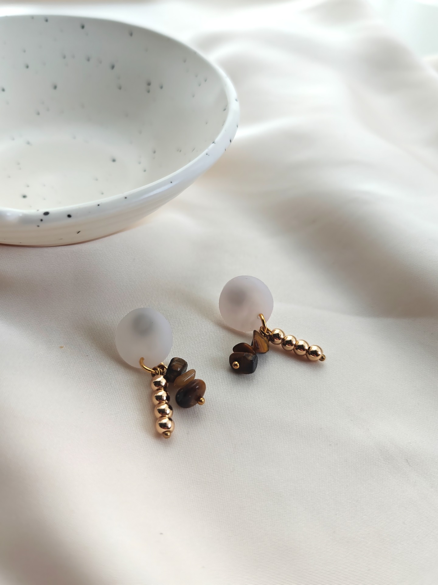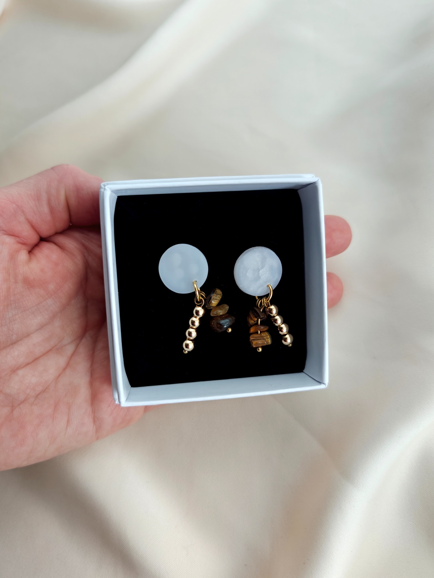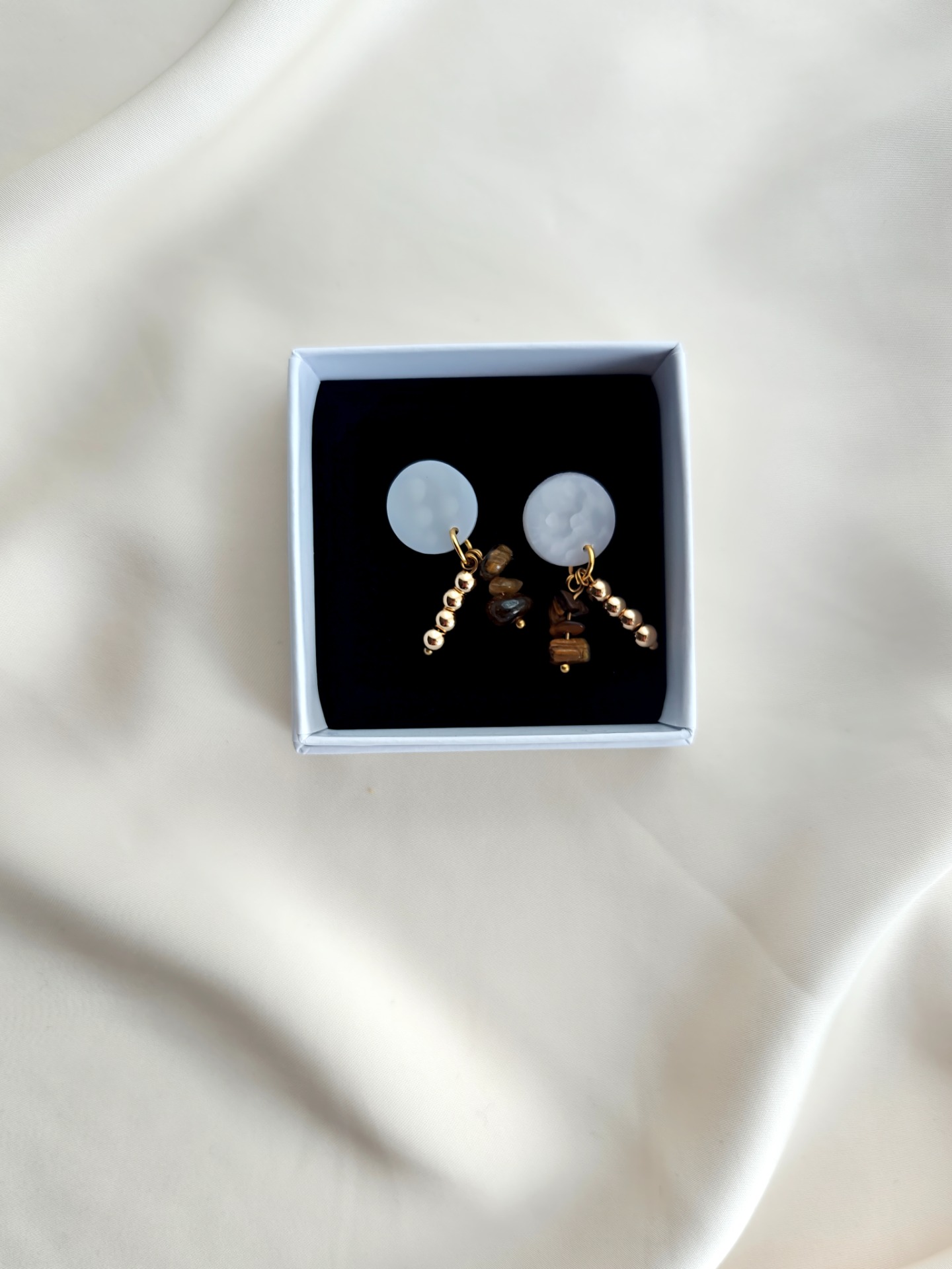 Polymeerisavesta valmistetut korvakorut tappikiinnityksellä. Kaikki koruosat nikkelivapaata kullattua kirurginterästä. Riipuksessa luonnonkiviä (tiikerinsilmä) ja synteettisiä helmiä.