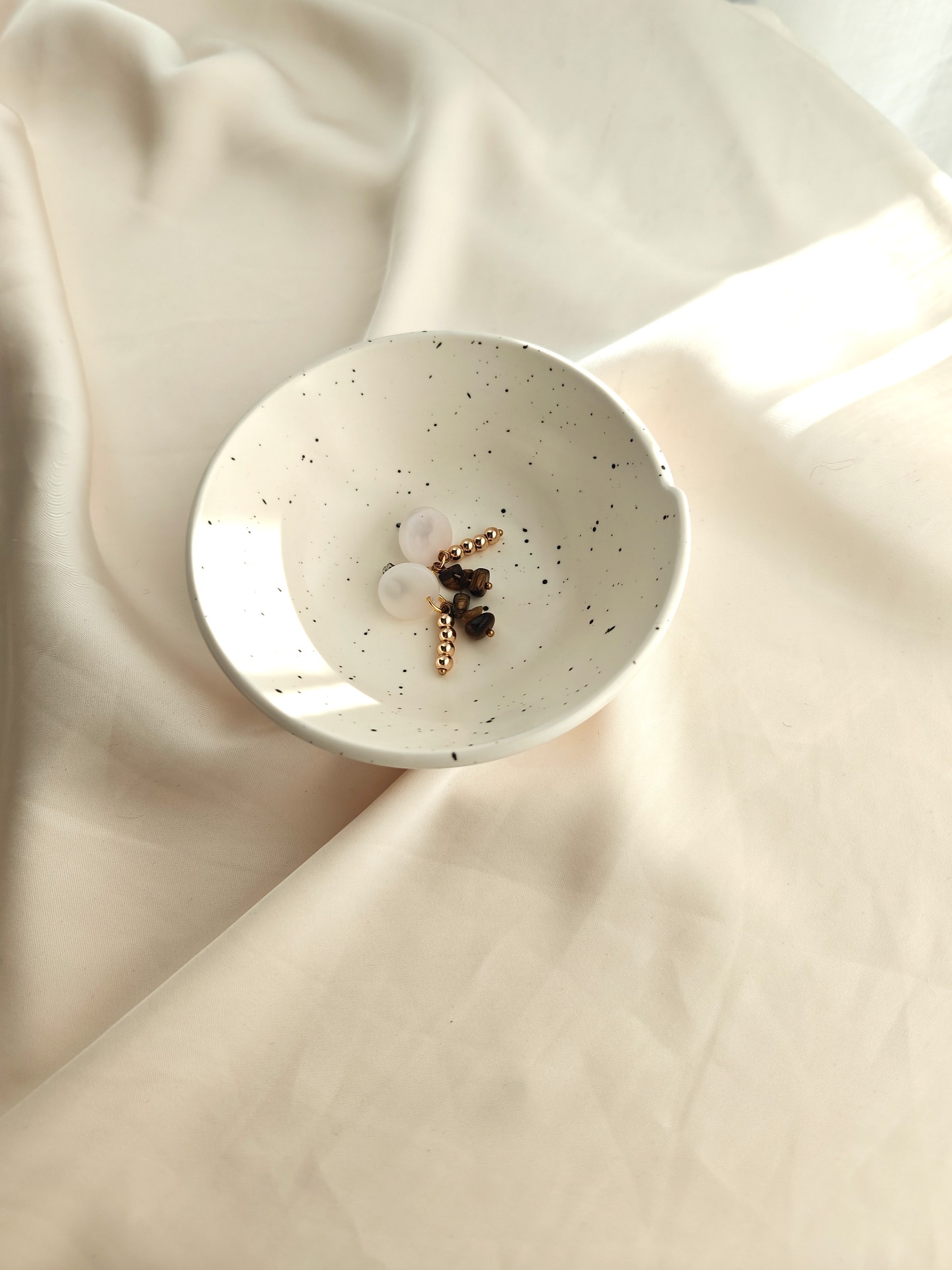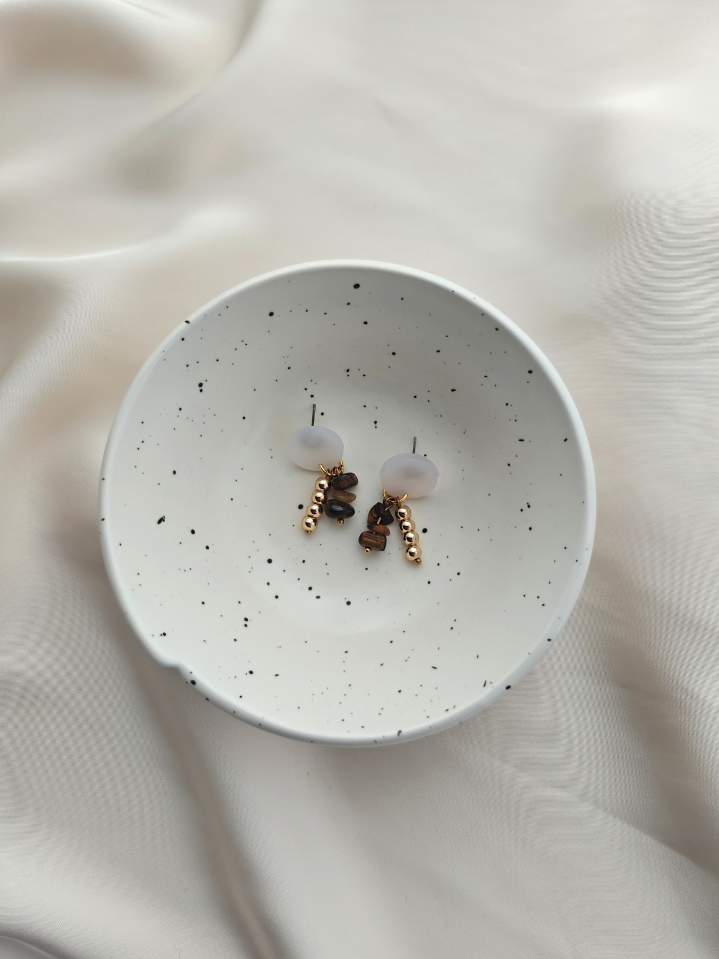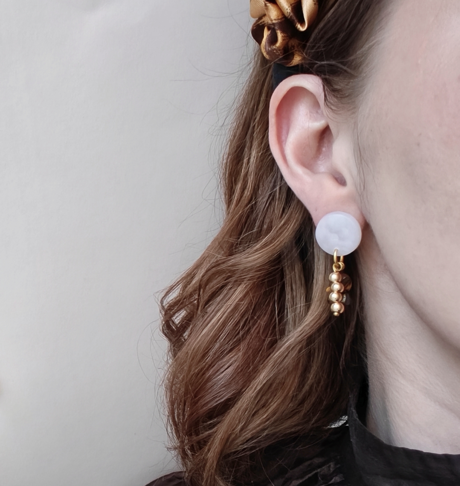 Polymeerisavesta valmistetut korvakorut tappikiinnityksellä. Kaikki koruosat nikkelivapaata kullattua kirurginterästä. Riipuksessa luonnonkiviä (tiikerinsilmä) ja synteettisiä helmiä.
