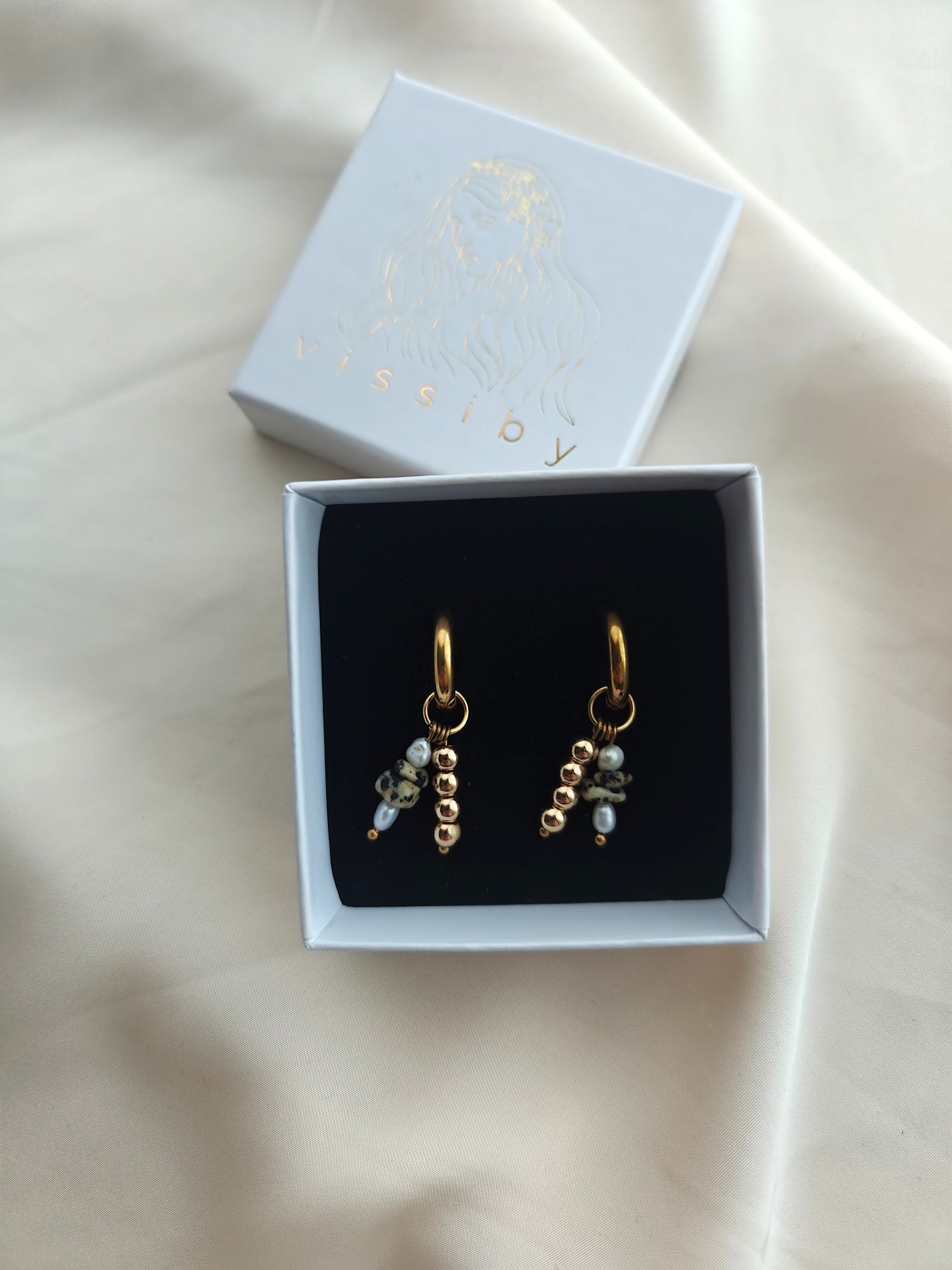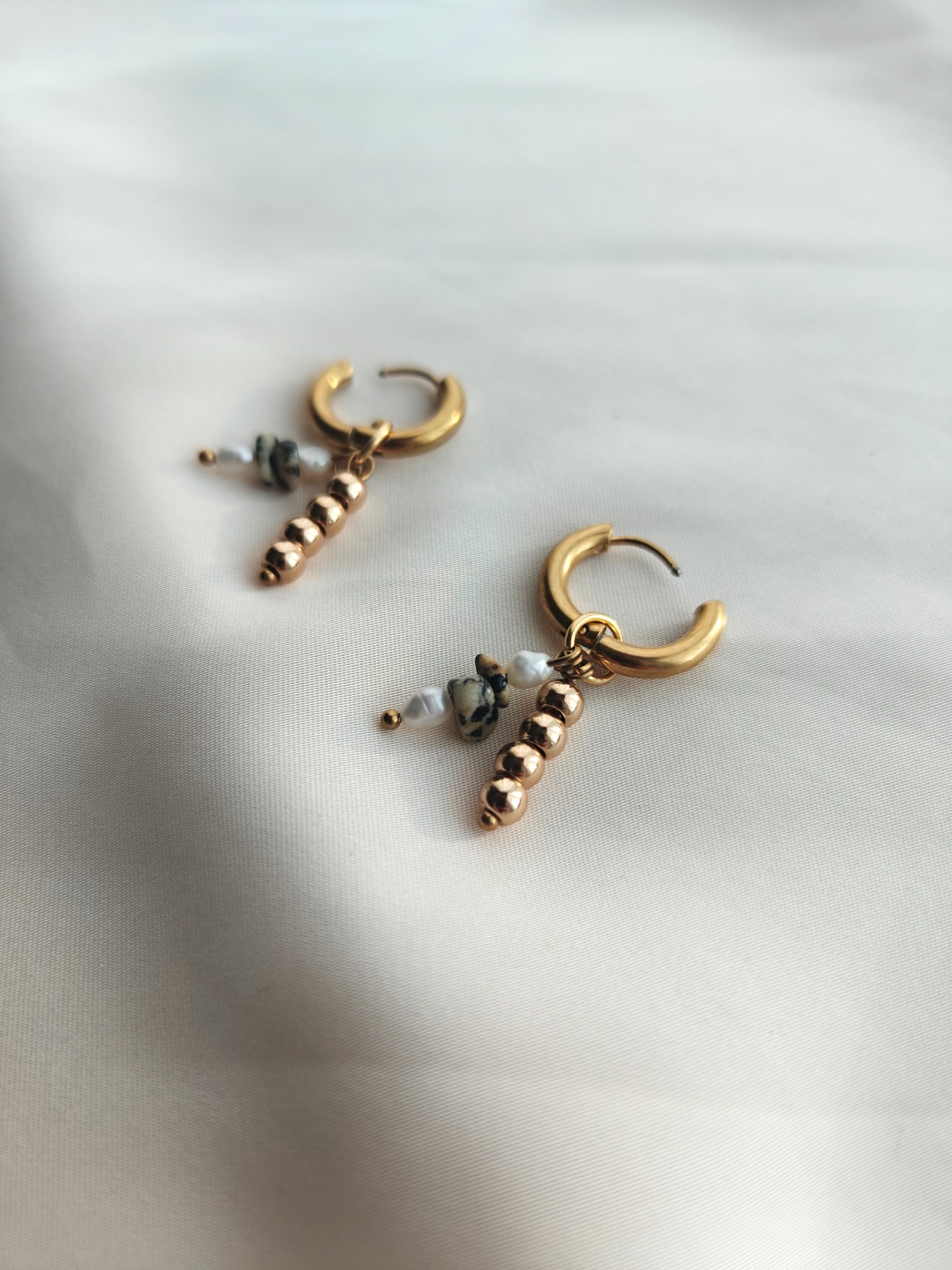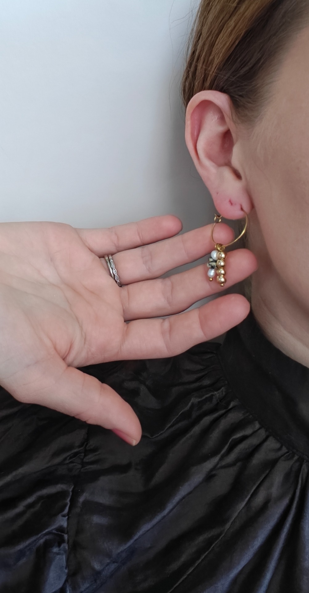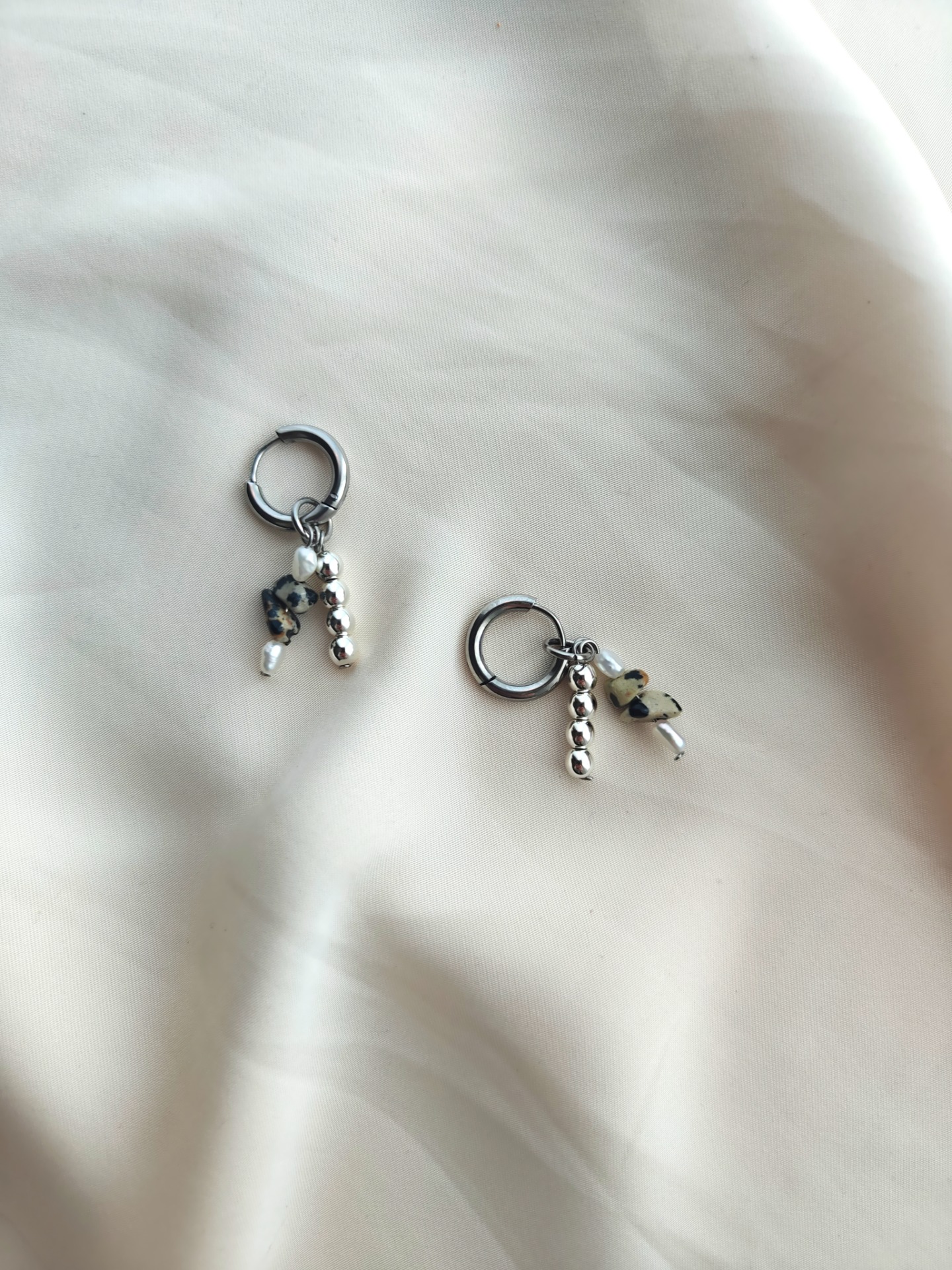 Lävistävä korunosa nikkelivapaata ruostumatonta terästä (kirurginterästä). Riipuksessa luonnonkivihelmiä (dalmatialainen), makeanvedenhelmiä sekä synteettisiä helmiä.