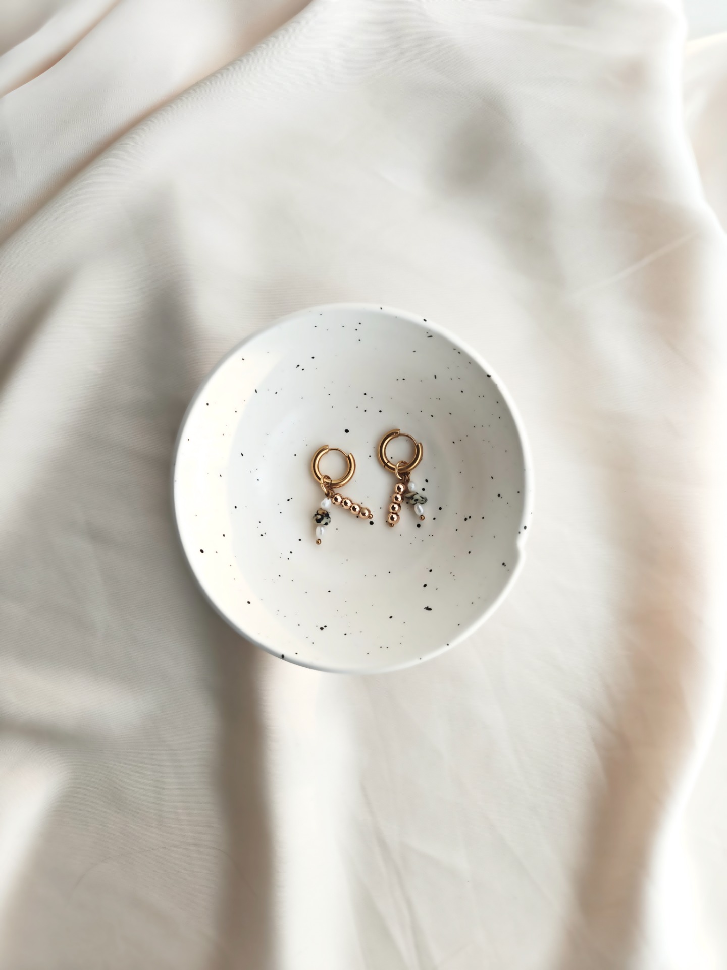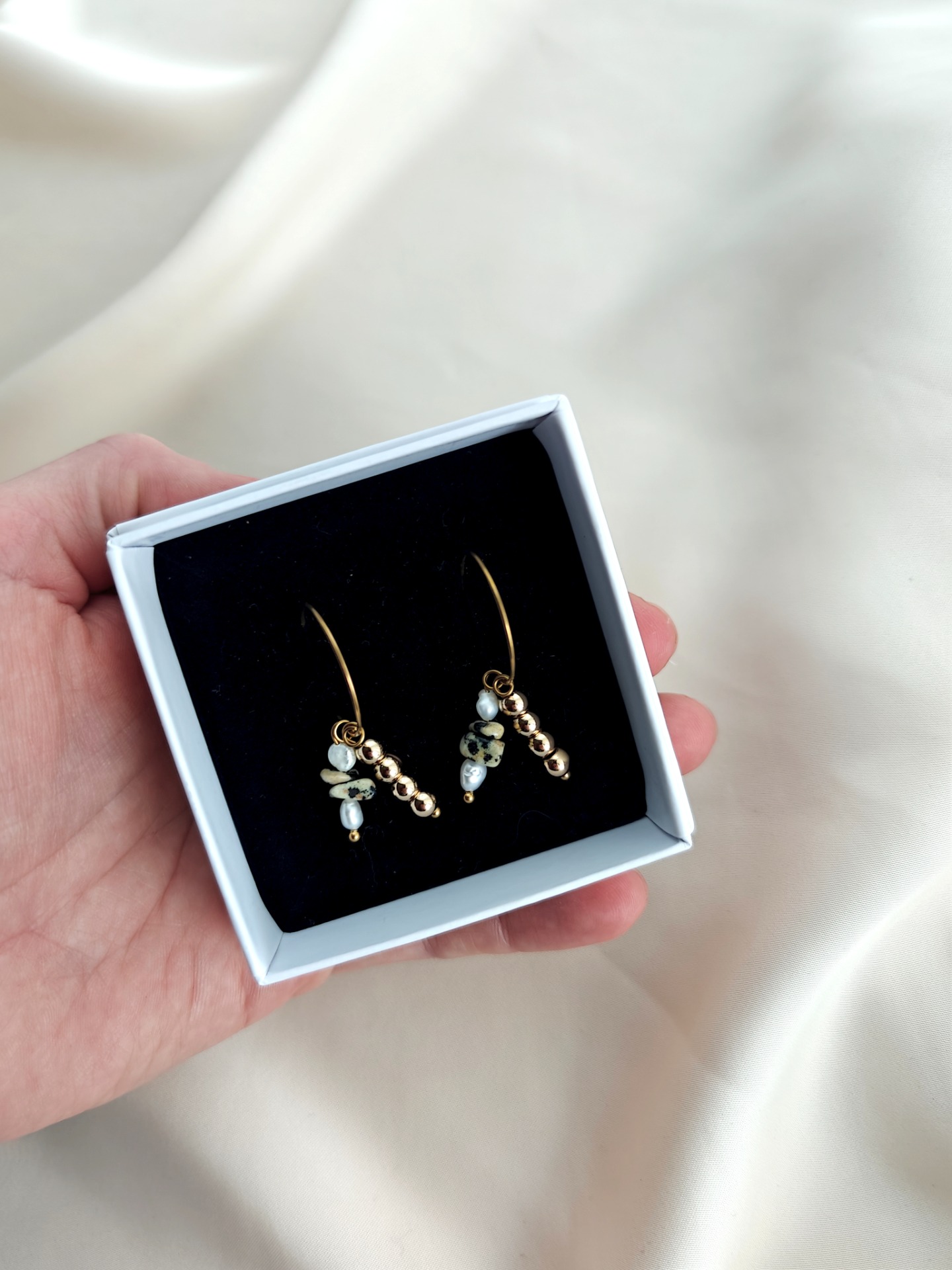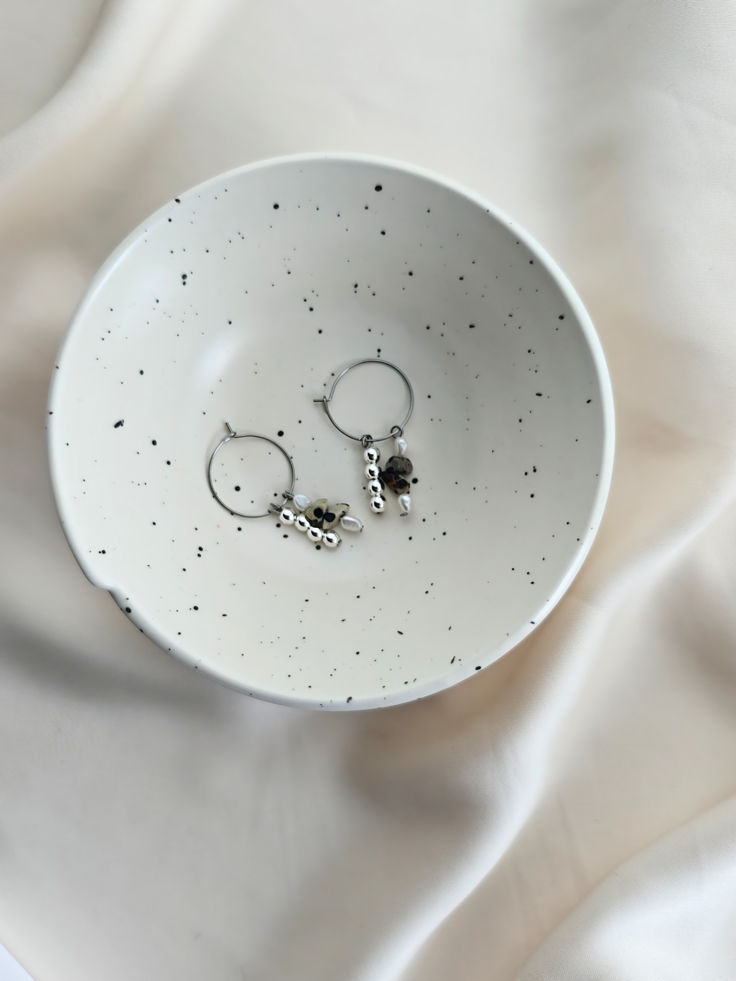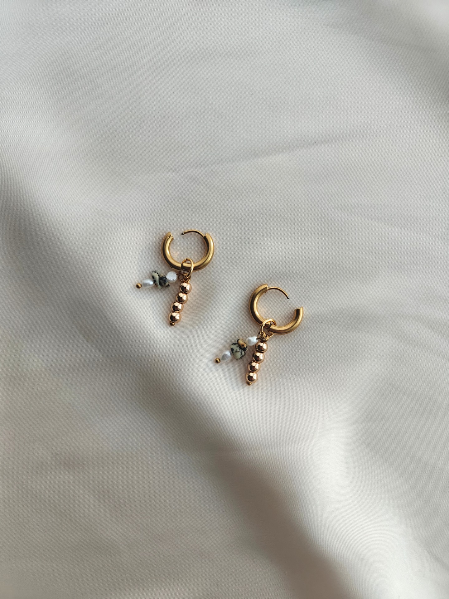 Lävistävä korunosa nikkelivapaata ruostumatonta terästä (kirurginterästä). Riipuksessa luonnonkivihelmiä (dalmatialainen), makeanvedenhelmiä sekä synteettisiä helmiä.