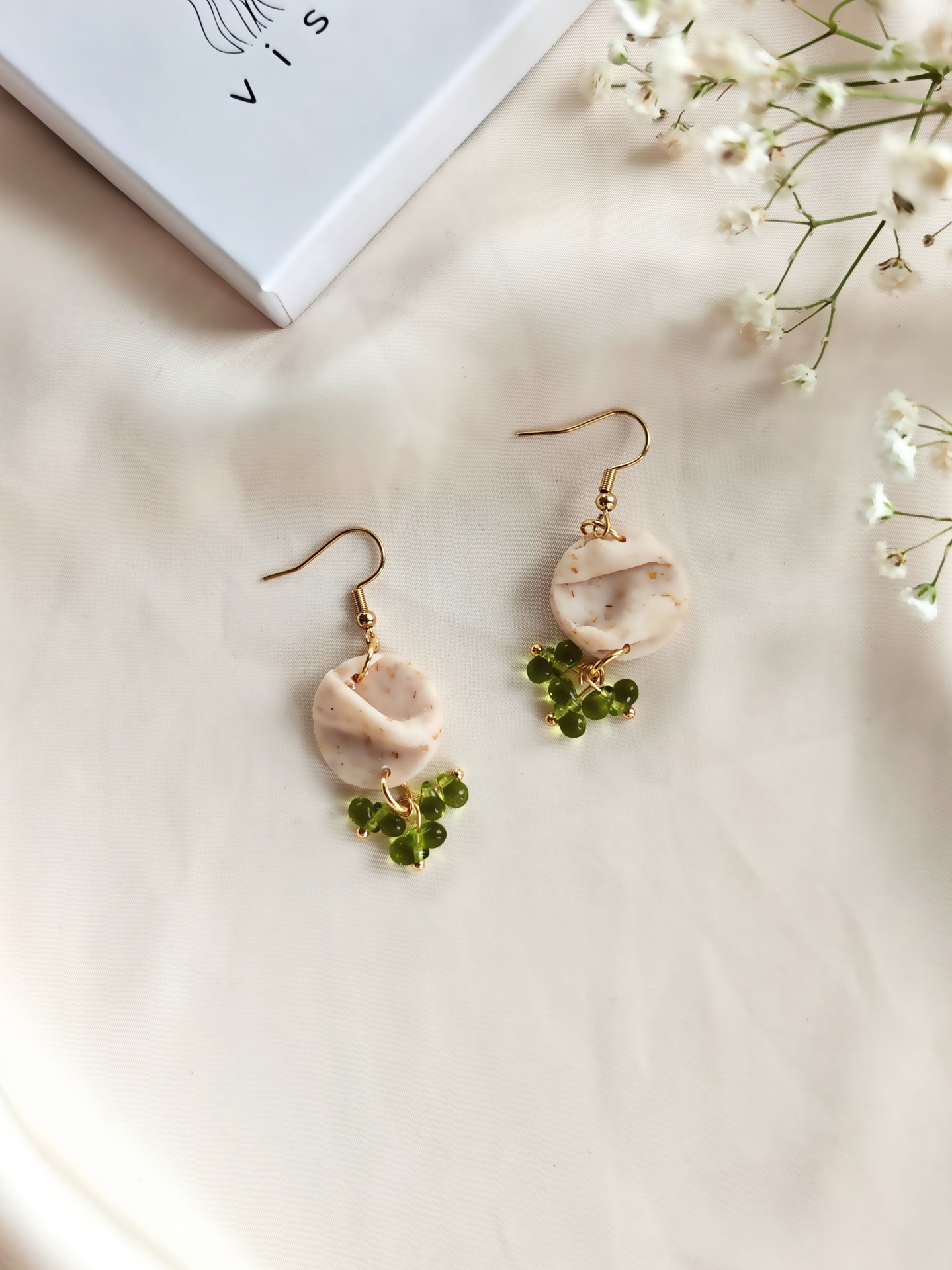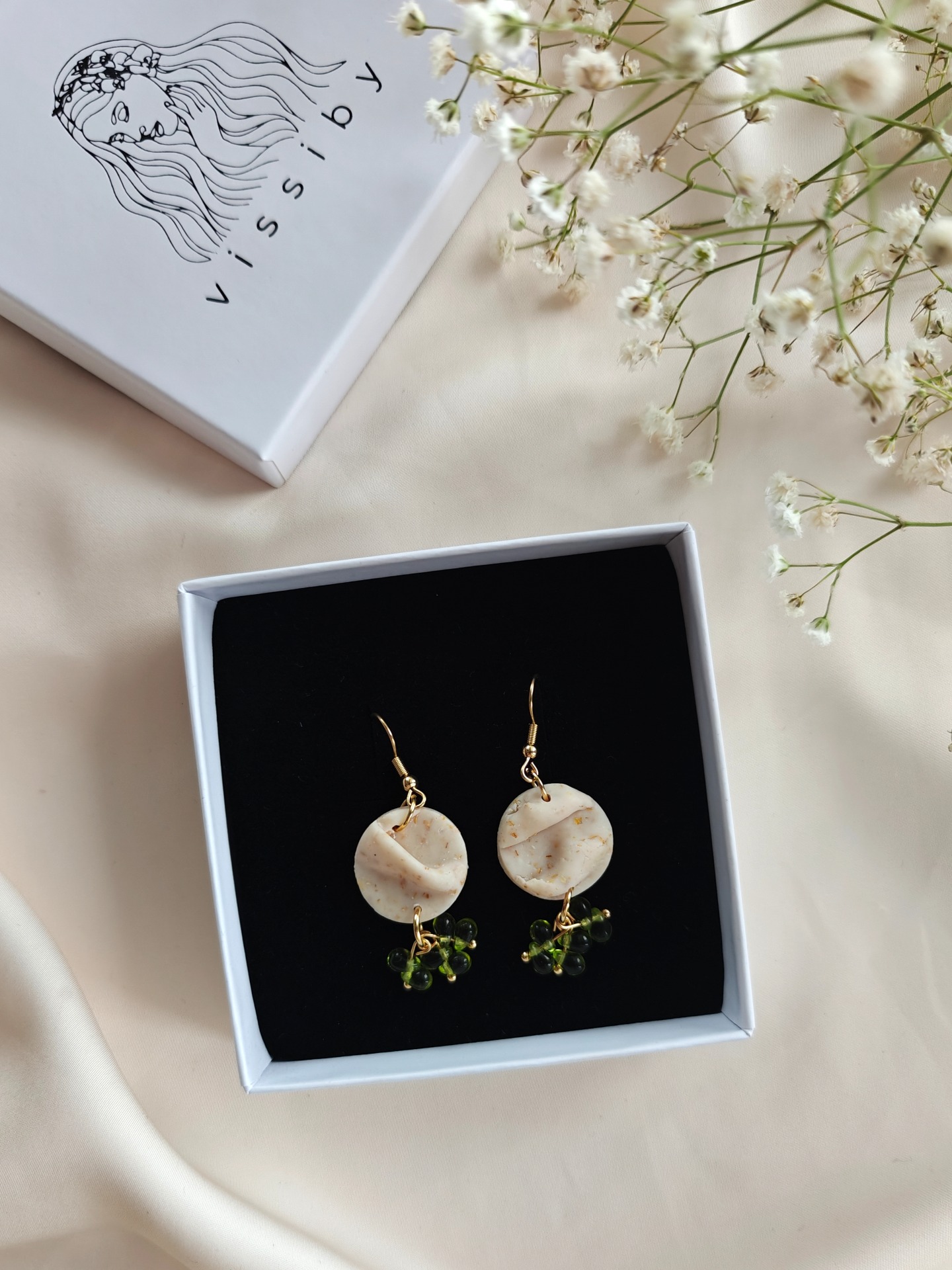Polymeerisavesta valmistetut korvakorut koukkukiinnityksellä. Lävistävät koruosat nikkelivapaata kirurginterästä.