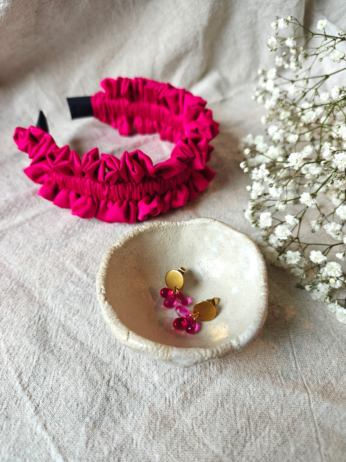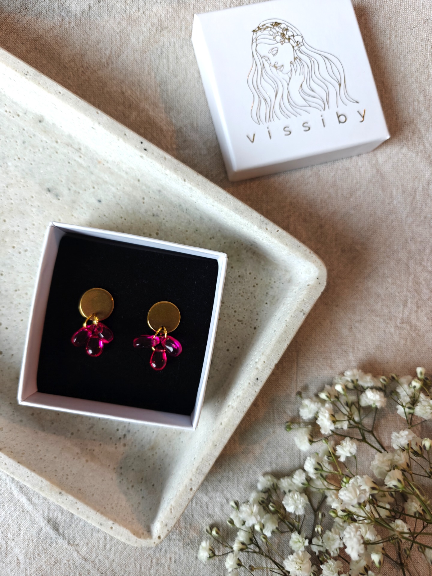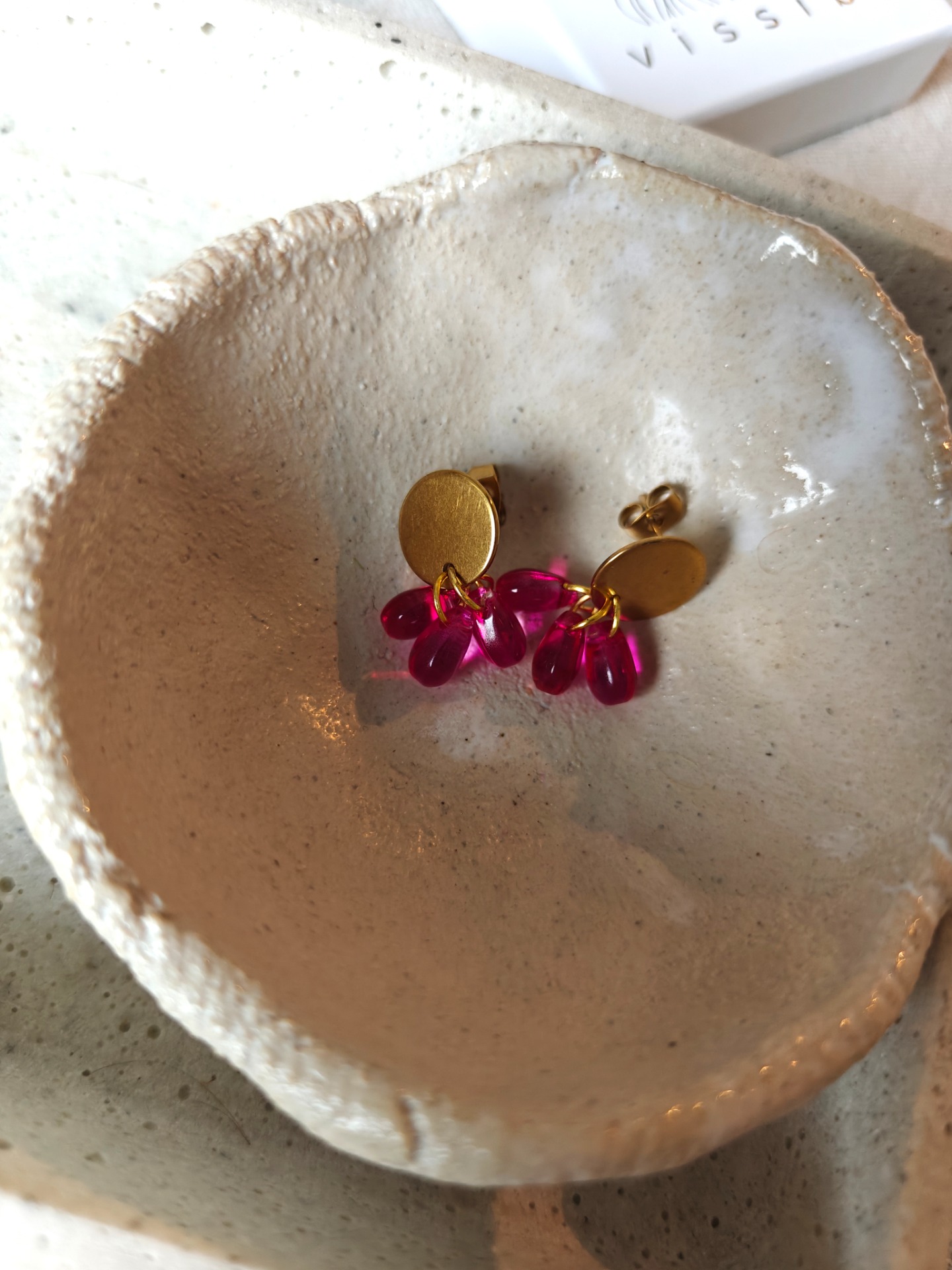 Lävistävä korunosa nikkelivapaata kullattua ruostumatonta terästä (kirurginterästä). Riipuksen helmet lasia.