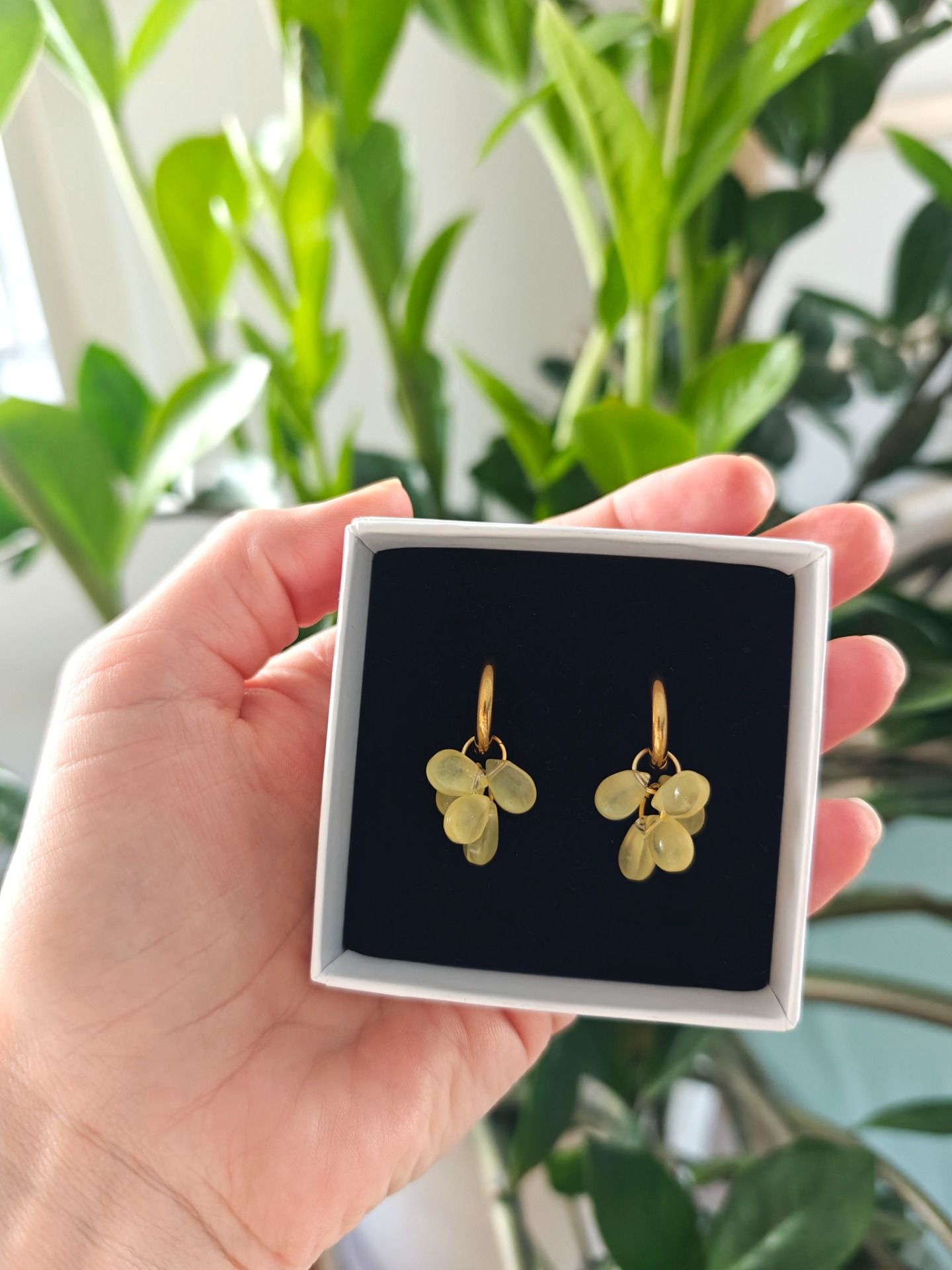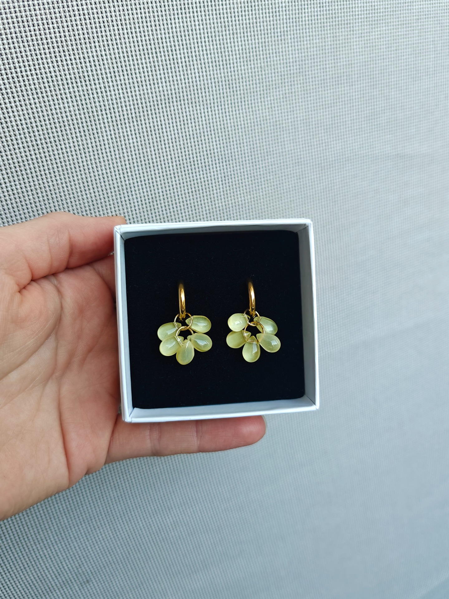 II-laatuinen tuote: kahdesta lasihelmestä on lohjennut pieni pala yläreunasta. Tämä näkyy oikein läheltä katsottuna, mutta kun korut ovat esimerkiksi korvissa, ei vikaa huomaa.