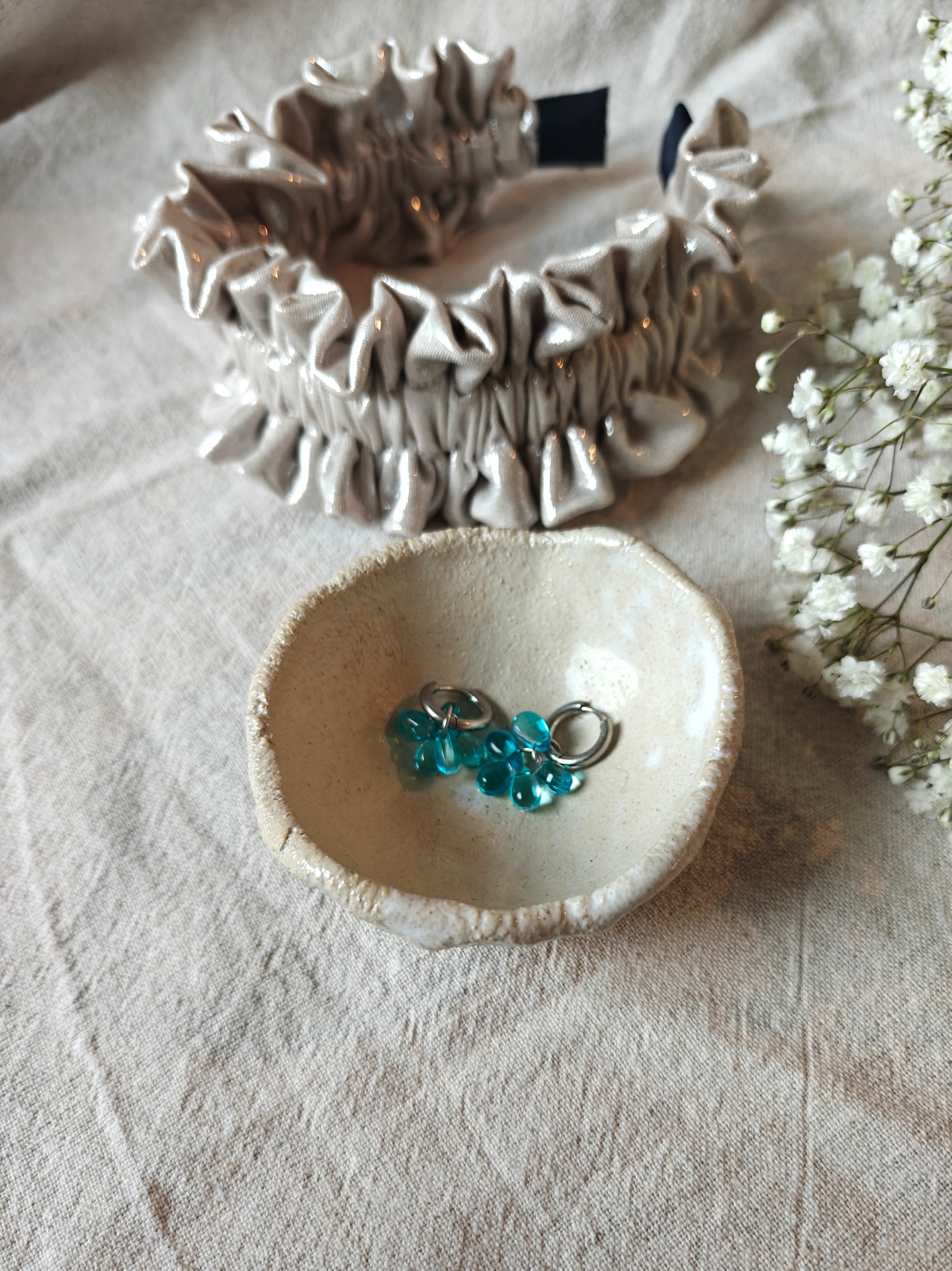 Lävistävä korunosa nikkelivapaata ruostumatonta terästä (kirurginterästä). Riipuksen helmet lasia.