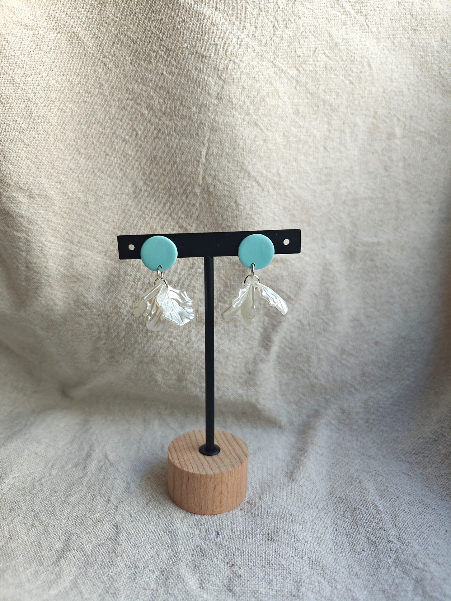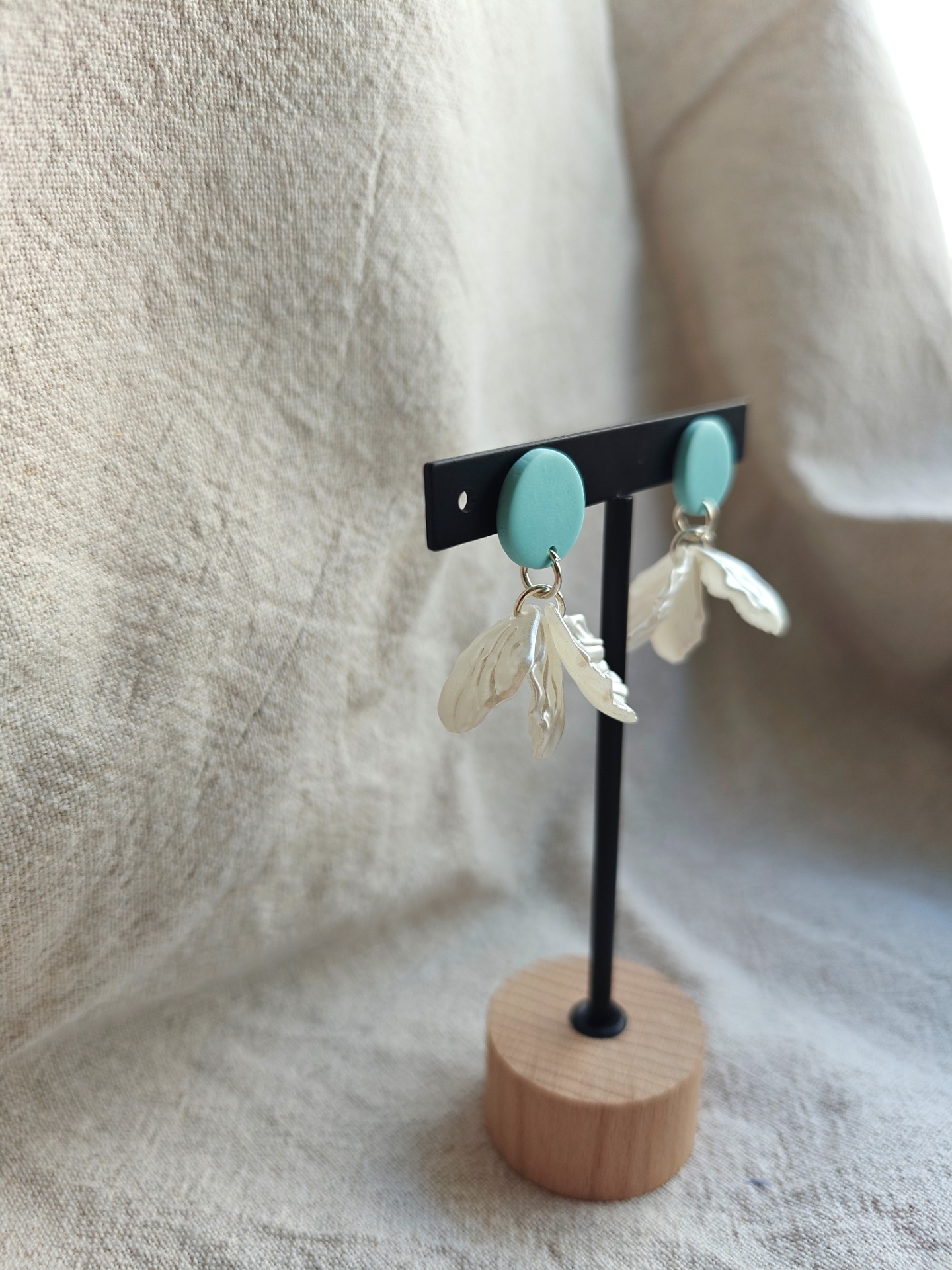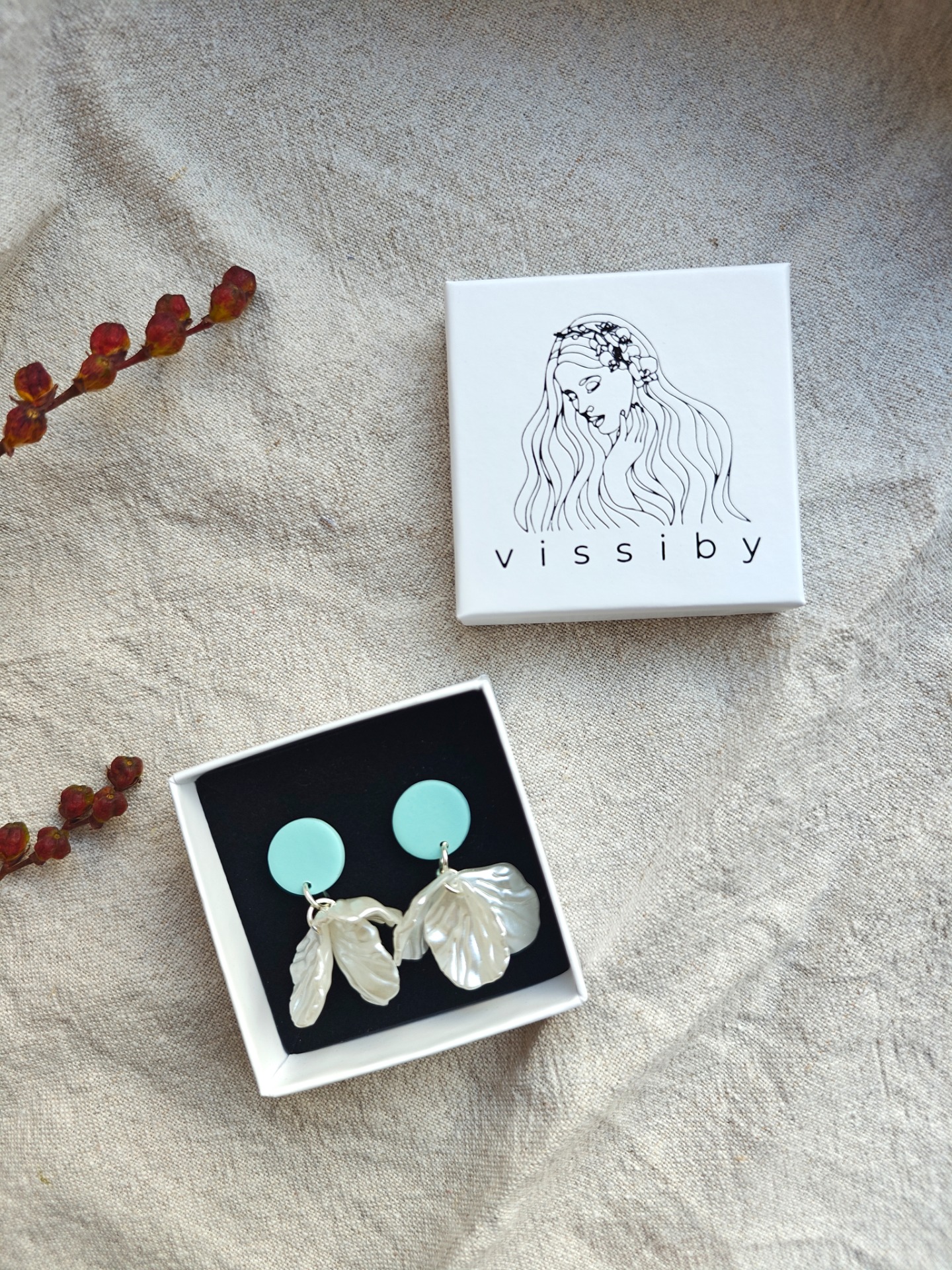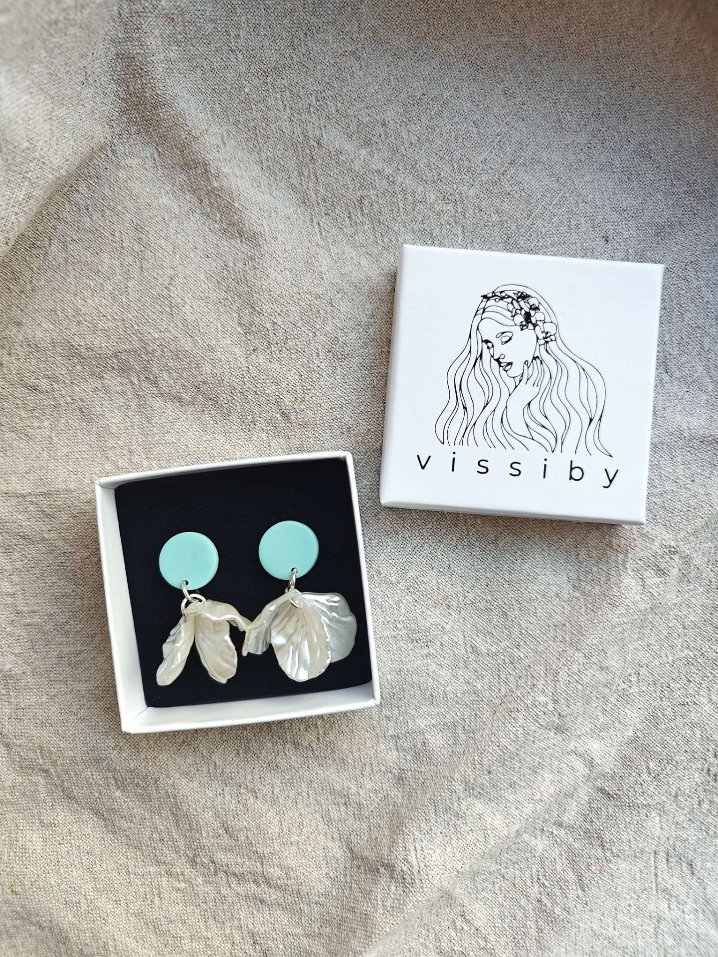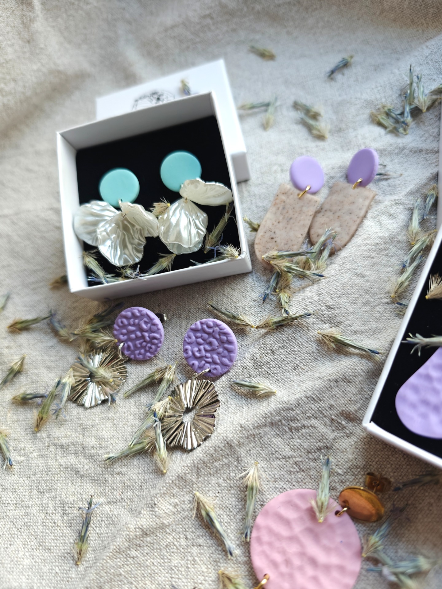 Polymeerisavesta valmistetut korvakorut tappikiinnityksellä. Lävistävät koruosat nikkelivapaata kirurginterästä.