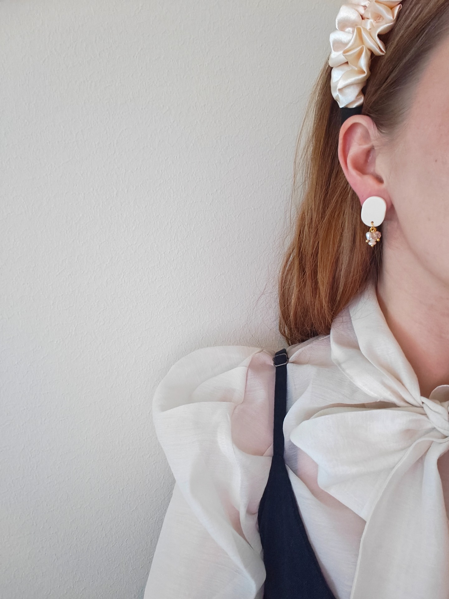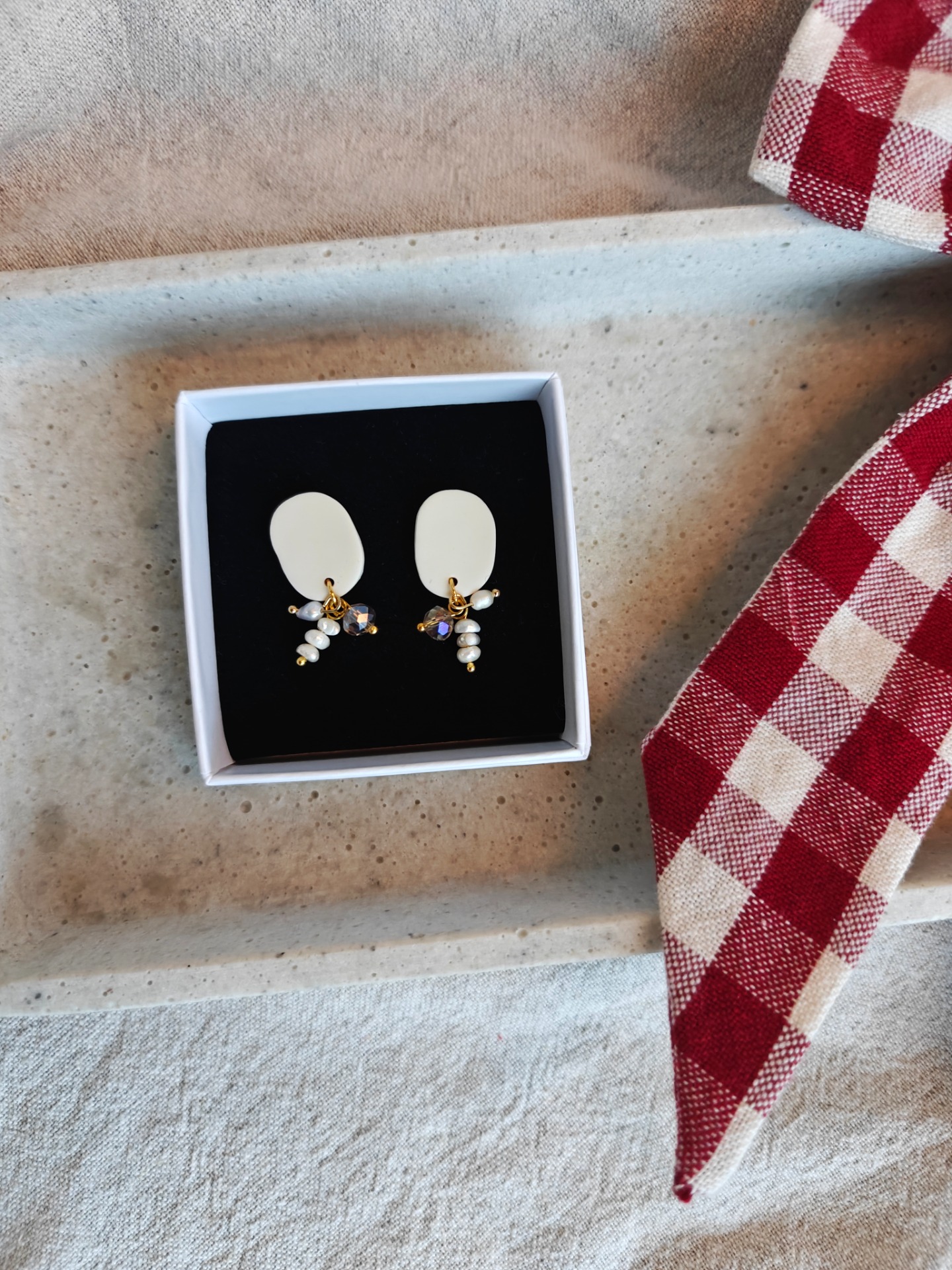 Polymeerisavesta valmistetut korvakorut tappikiinnityksellä. Lävistävät koruosat sekä korvakorun tausta nikkelivapaata kirurginterästä, joka ei allergisoi. Riipuksen helmet akryylia.