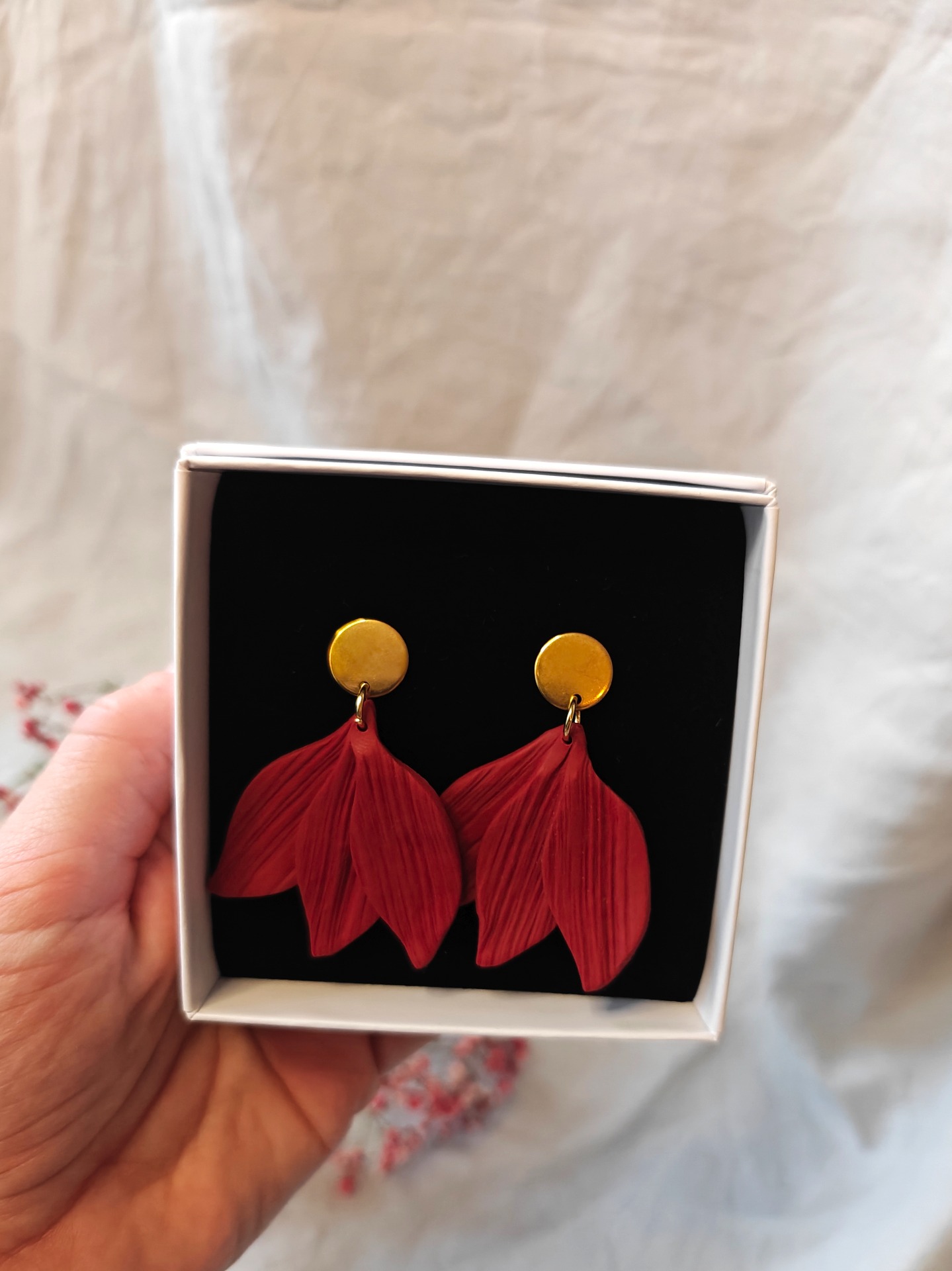 Polymeerisavesta käsityönä valmistetut korvakorut tappikiinnityksellä. Ihon kanssa kosketuksiin tulevat koruosat nikkelivapaata kirurginterästä.