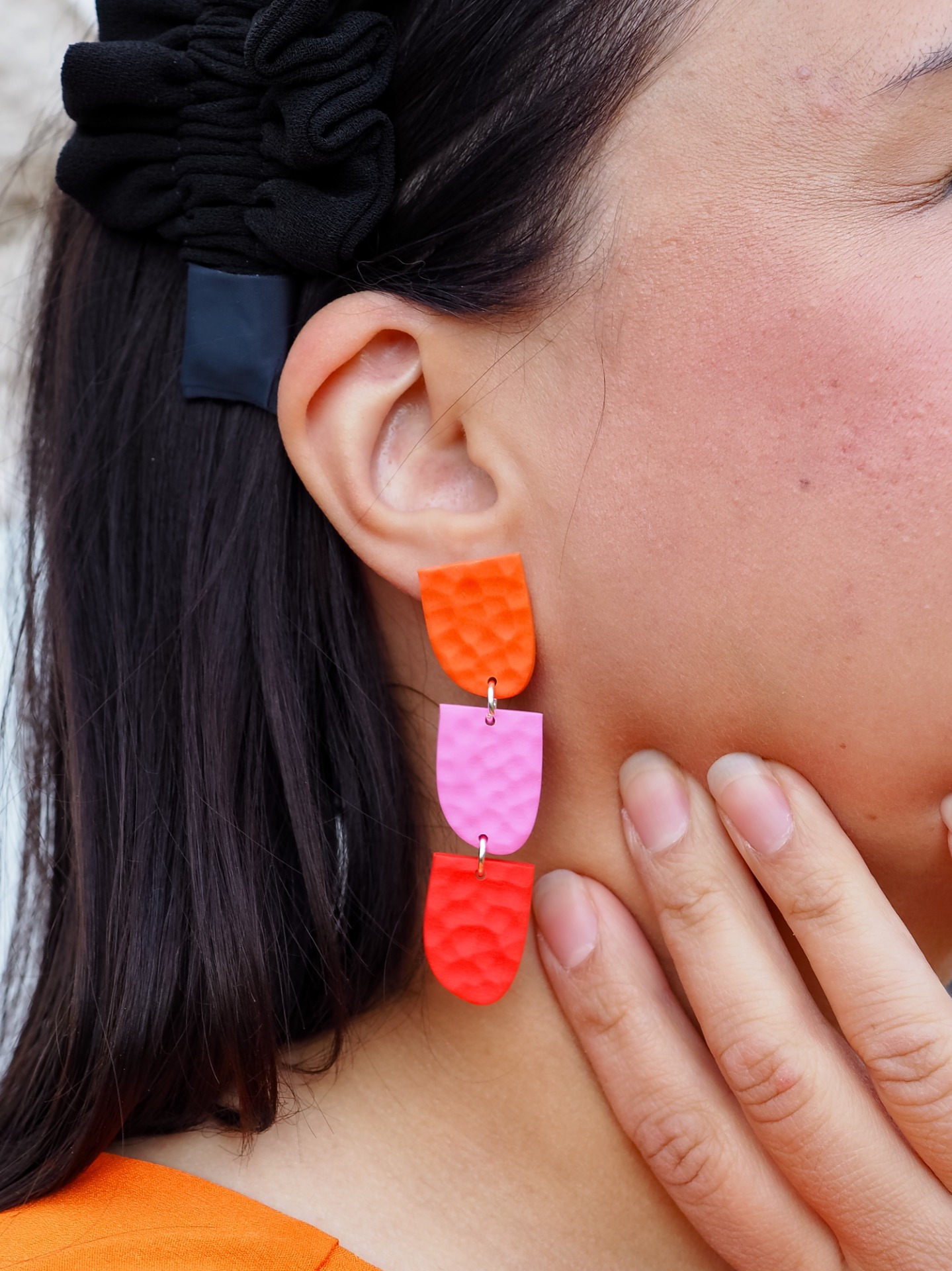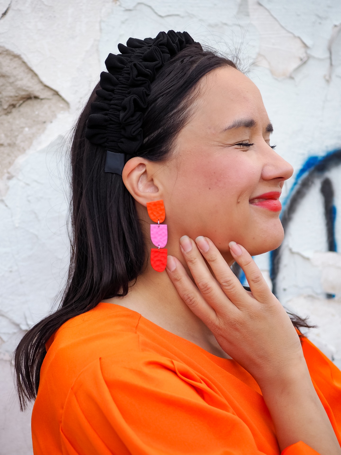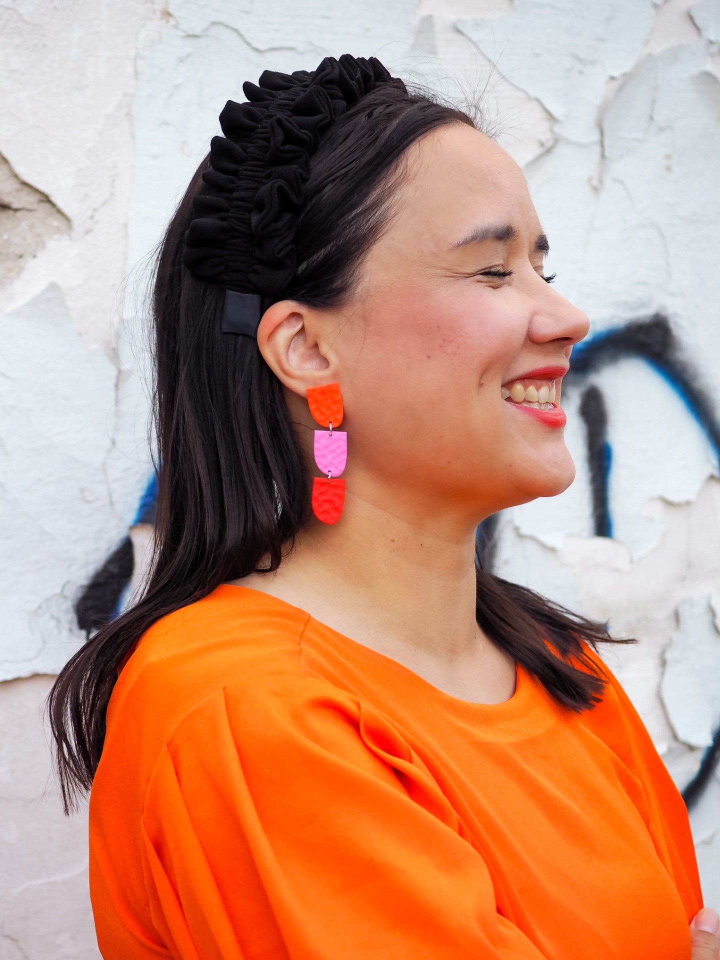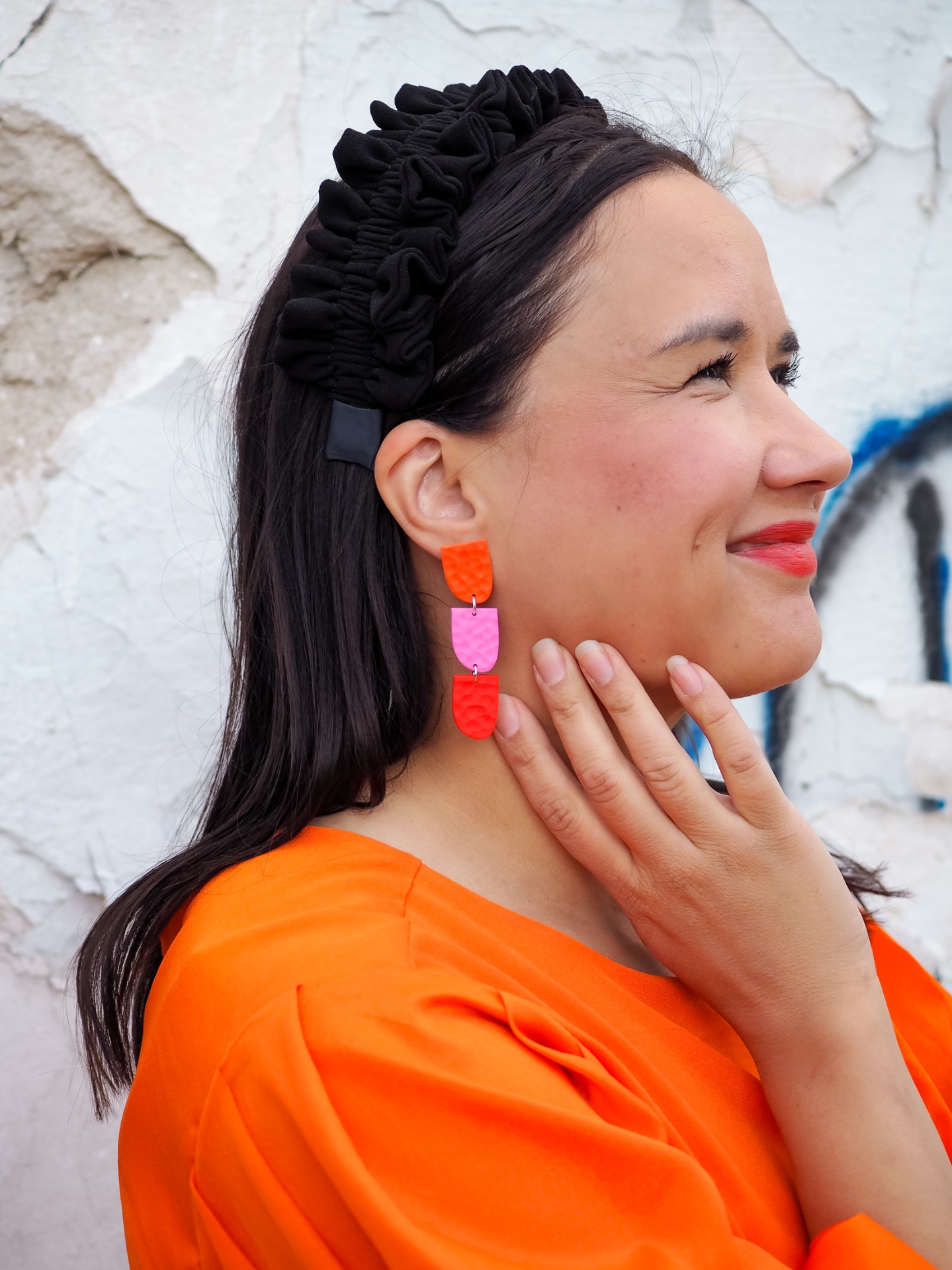 Polymeerisavesta käsityönä valmistetut korvakorut tappikiinnityksellä. Ihon kanssa kosketuksiin tulevat koruosat nikkelivapaata kirurginterästä.