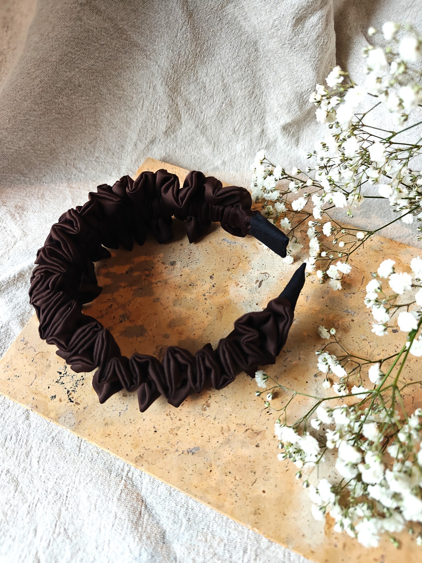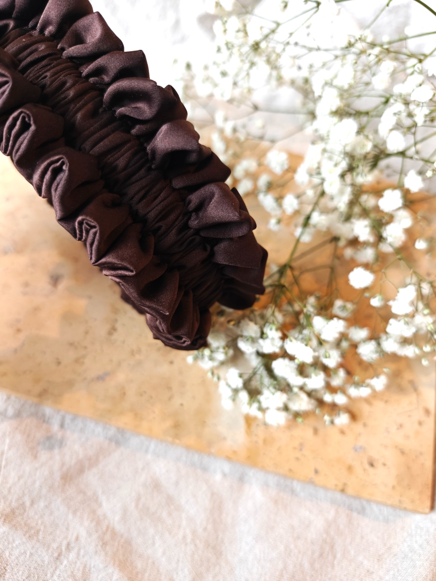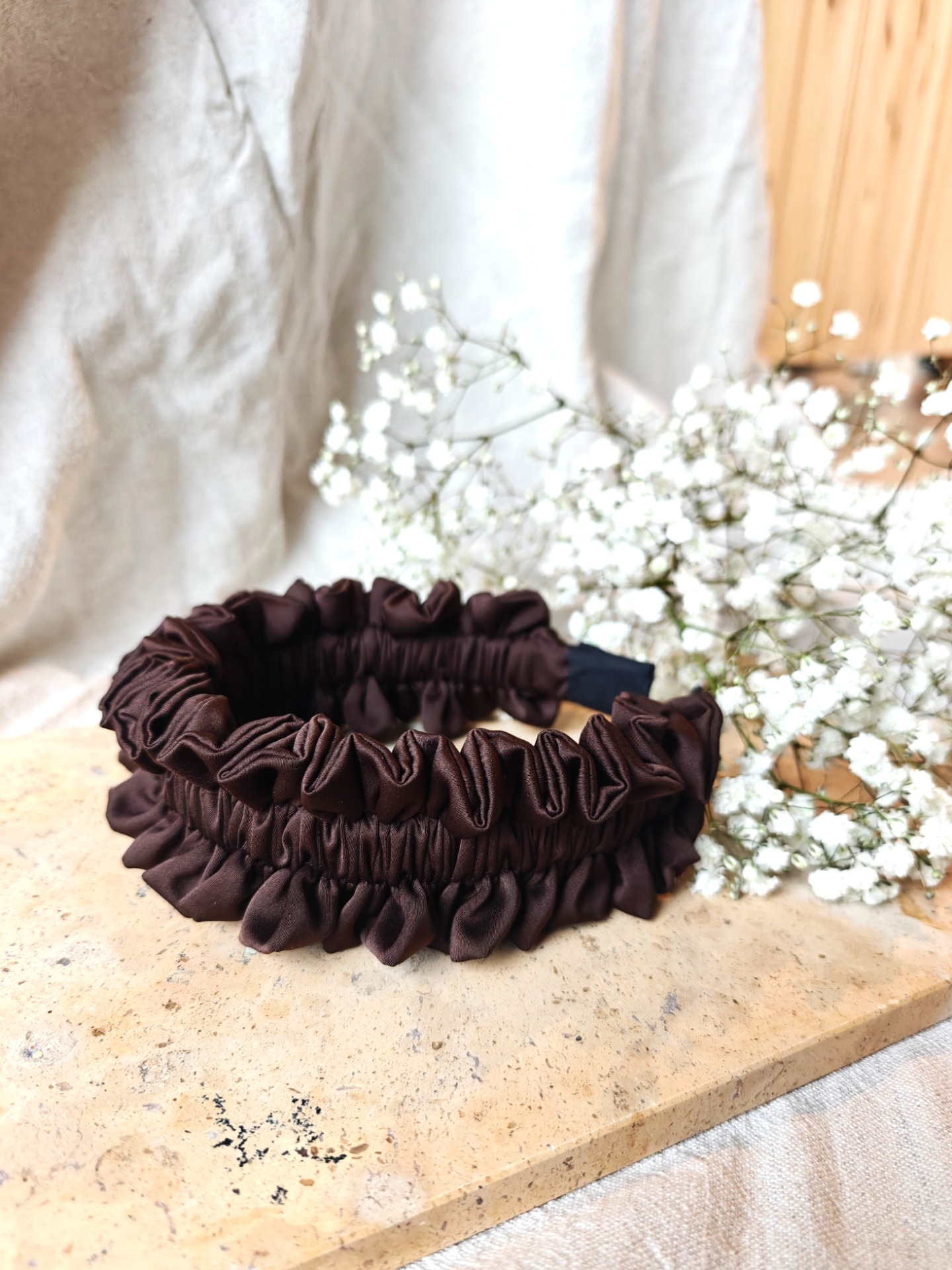 Tämä ylellisestä, kauniisti laskostuvasta kankaasta käsityönä valmistettu hiuspanta kääntää takuulla katseita. Huonon hiuspäivän pelastaminen ei ole koskaan ollut näin helppoa!