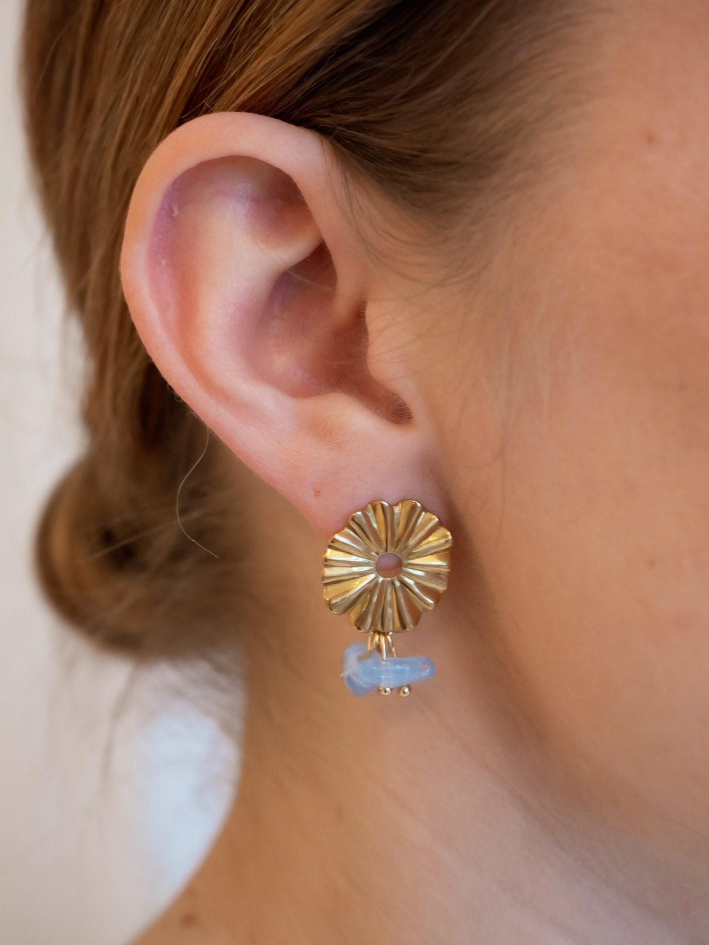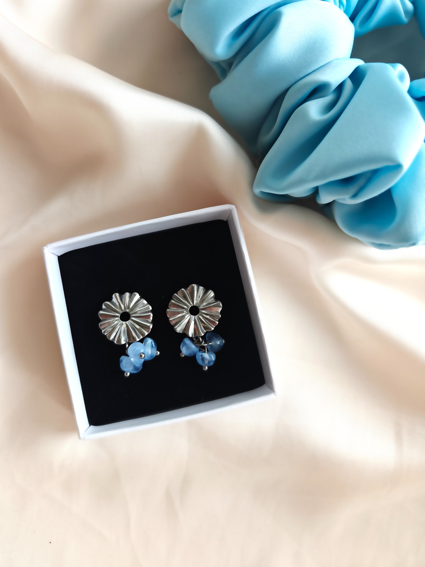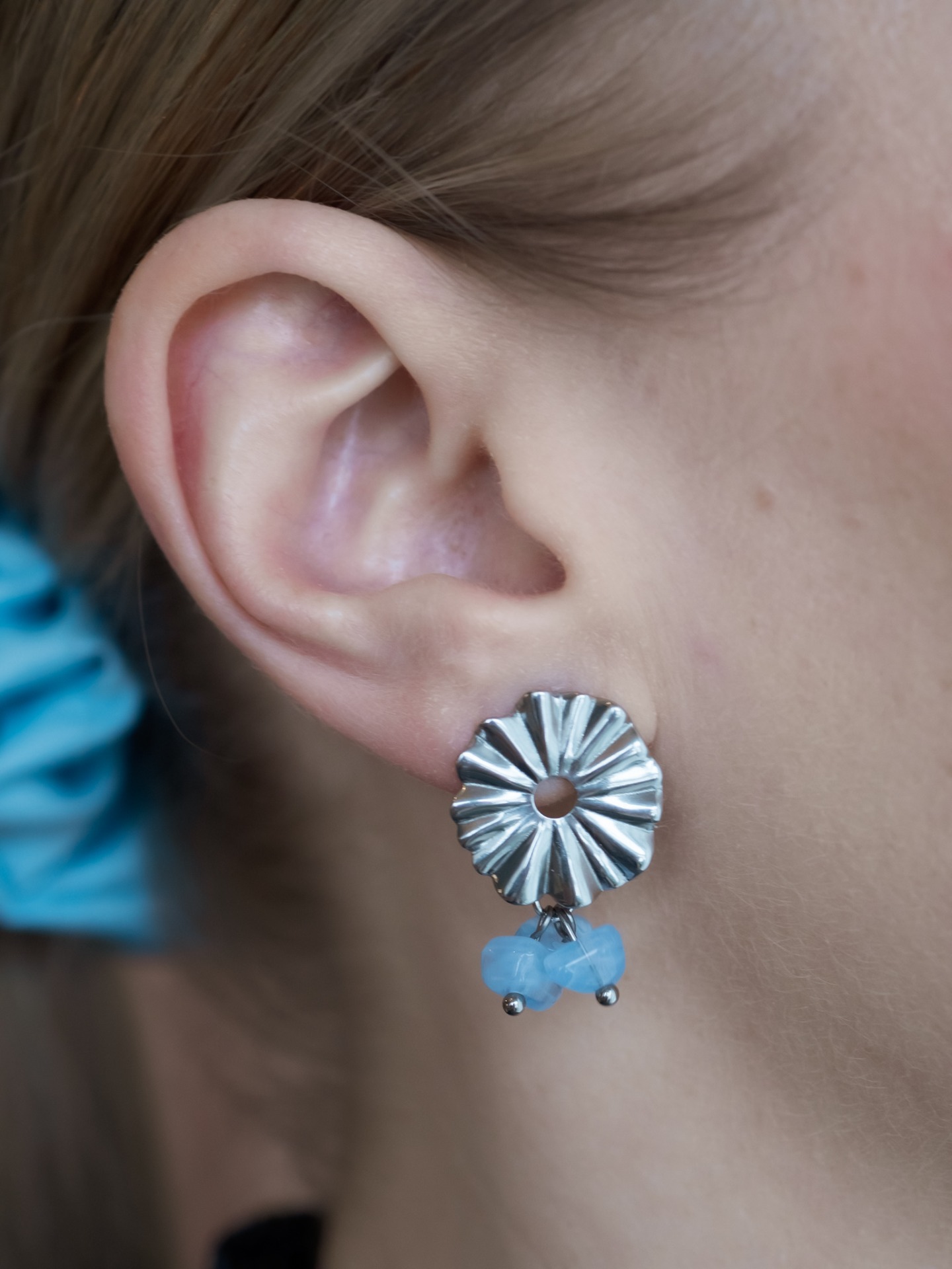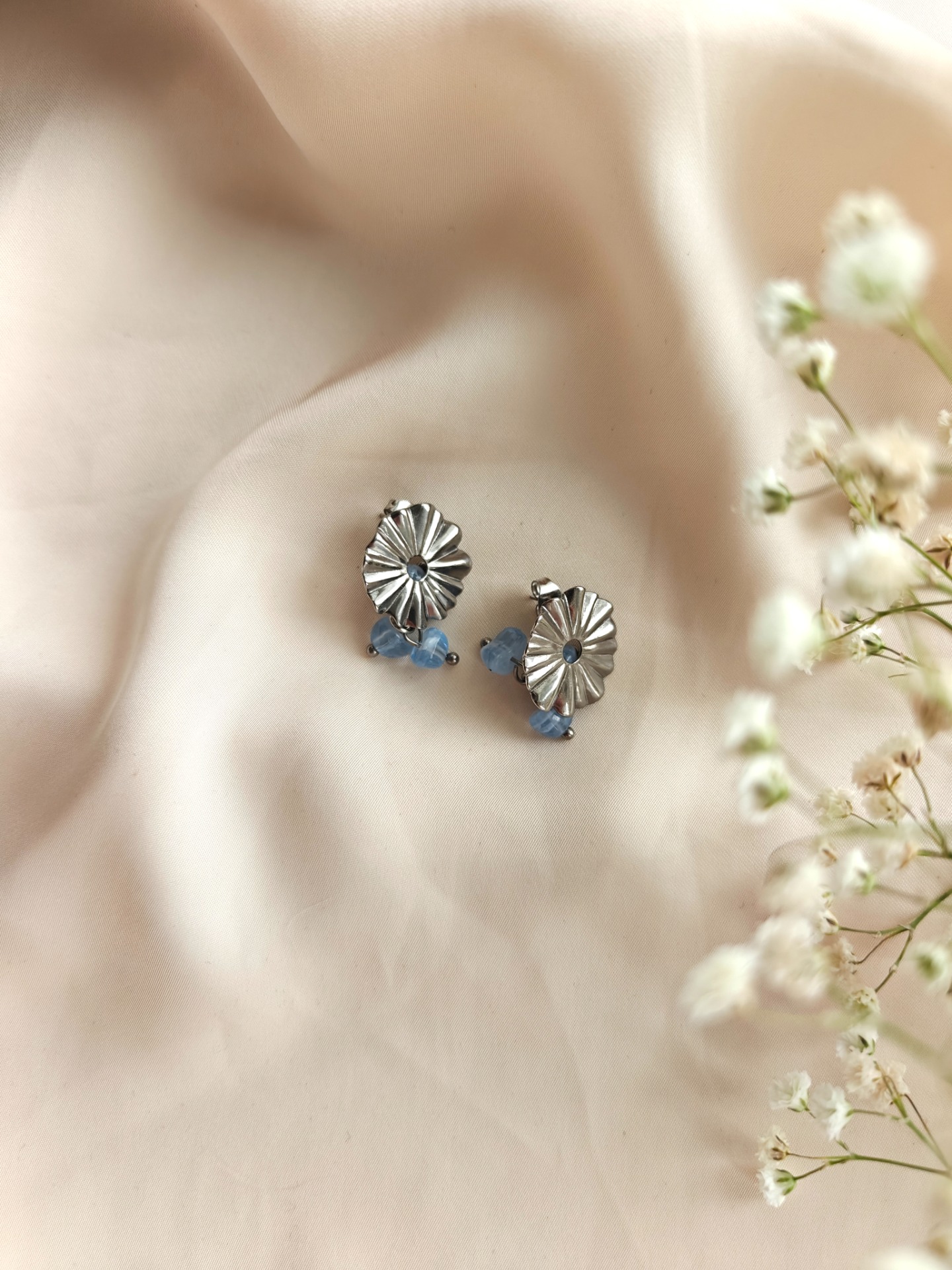Korvakorut tappikiinnityksellä. Lävistävät koruosat nikkelivapaata kirurginterästä. Riipuksessa lasihelmiä.