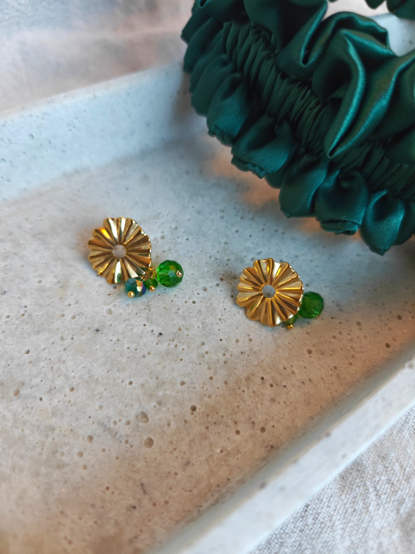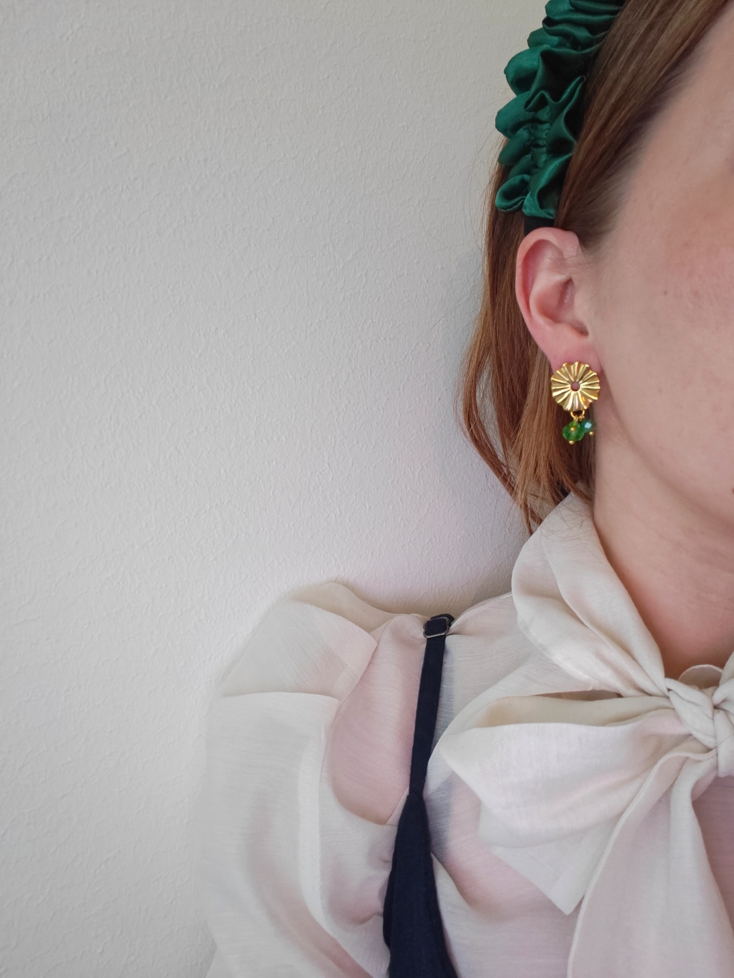 Korvakorut tappikiinnityksellä. Lävistävät koruosat nikkelivapaata kullattua kirurginterästä. Riipuksena sekä muovi- että lasihelmiä.