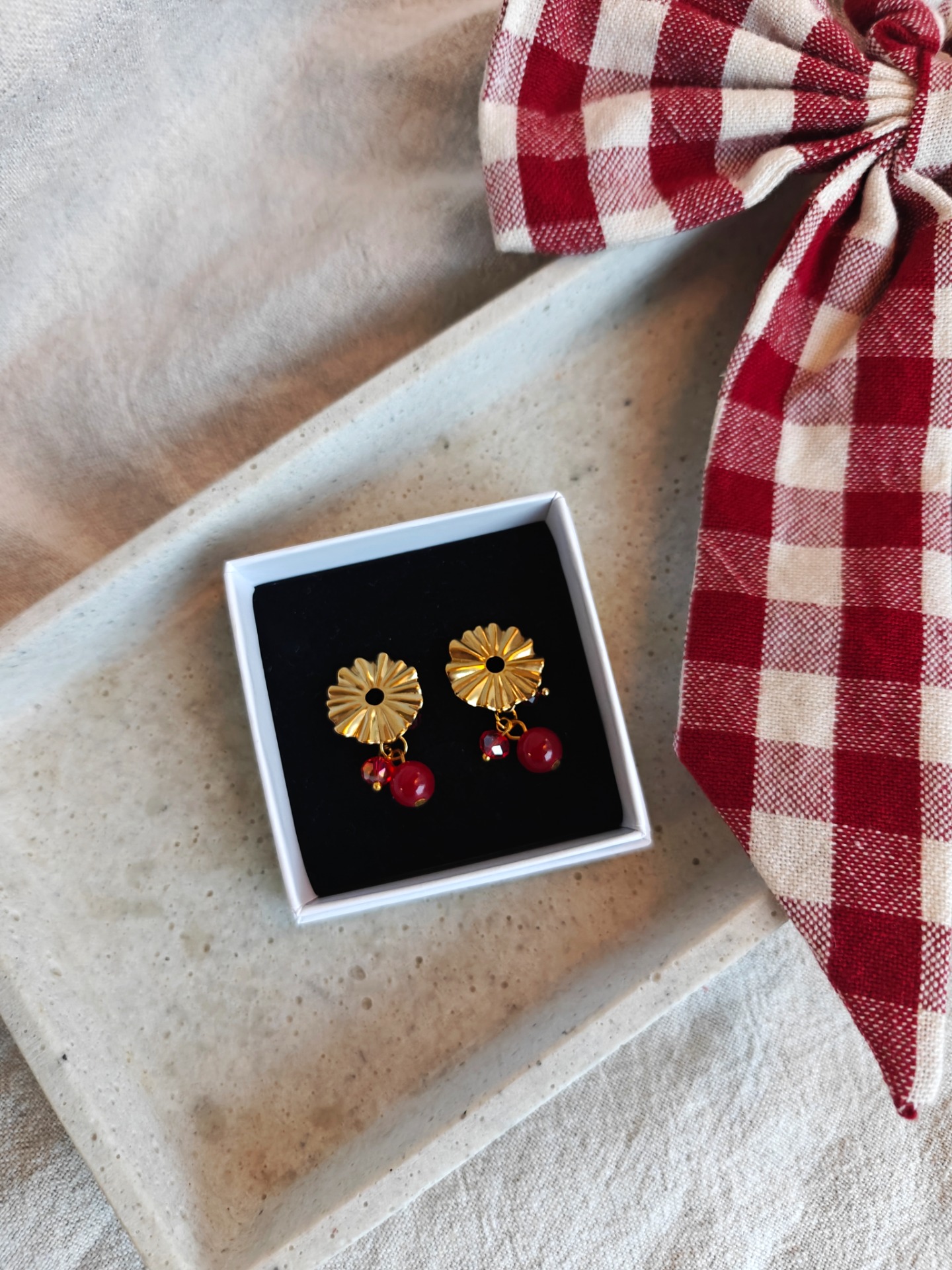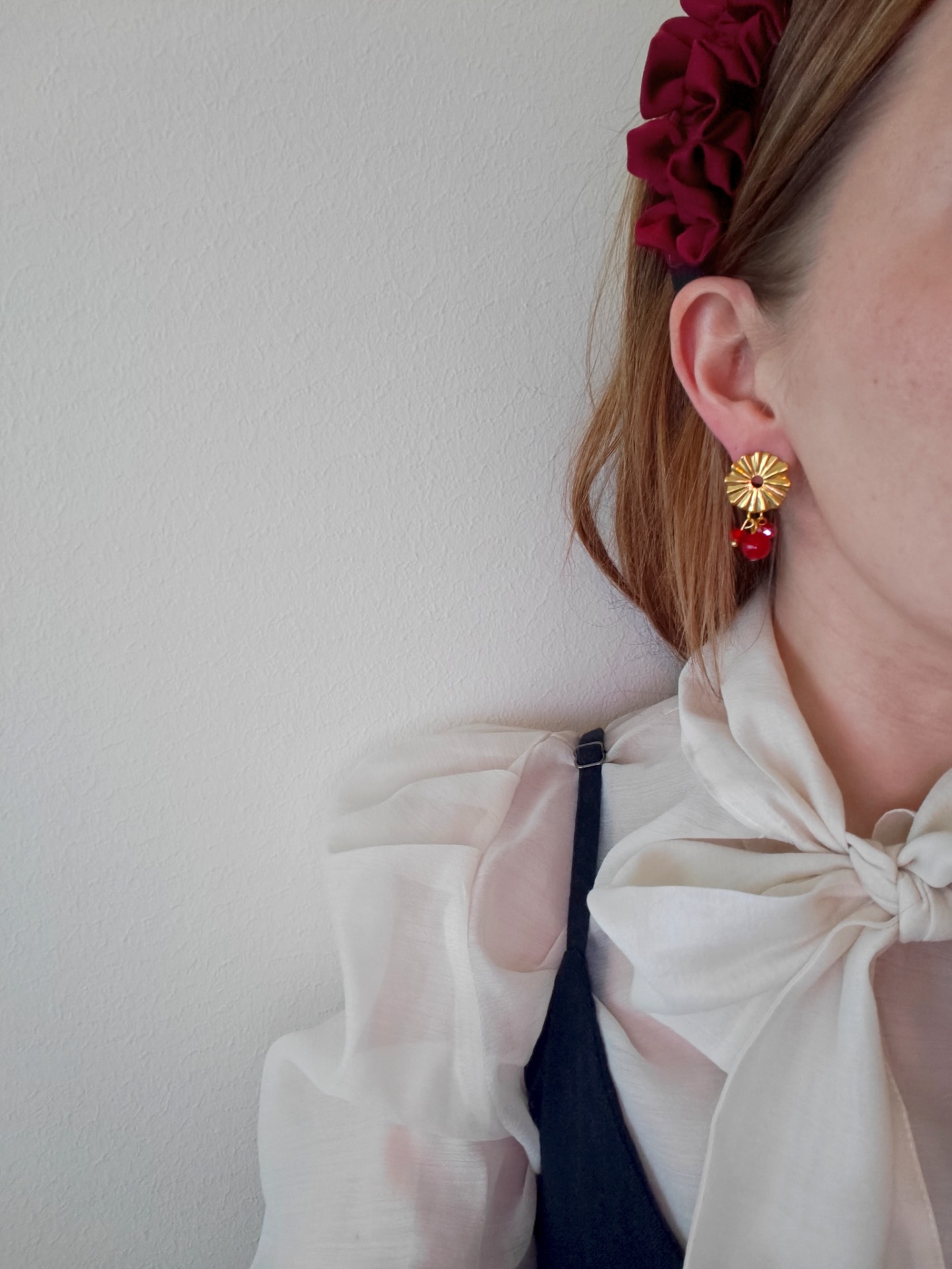 Korvakorut tappikiinnityksellä. Lävistävät koruosat nikkelivapaata kullattua kirurginterästä. Riipuksena sekä muovi- että lasihelmiä.